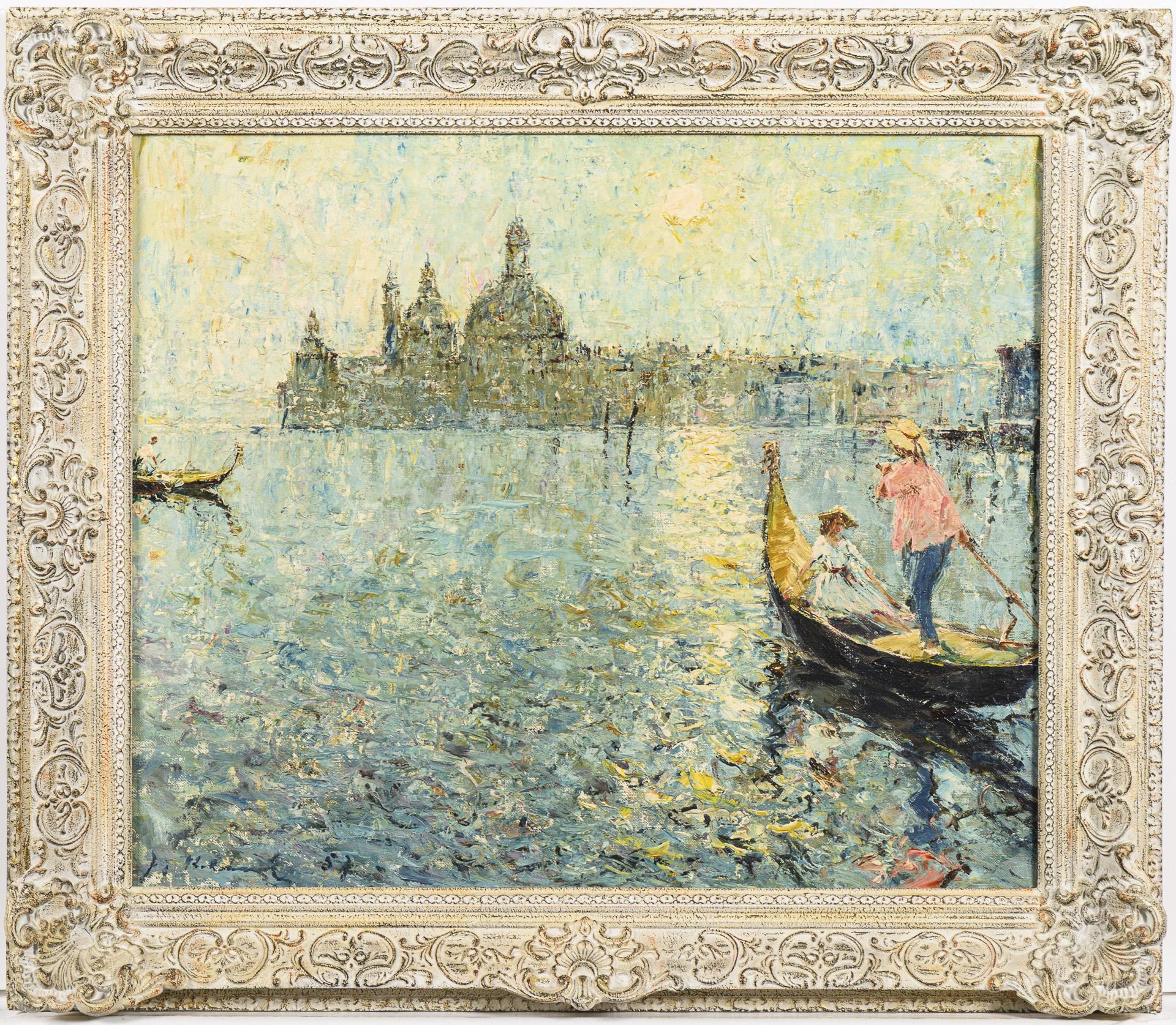 Gondeln auf dem Meer nahe der Stadt und der Kirche Santa Maria della Salute.