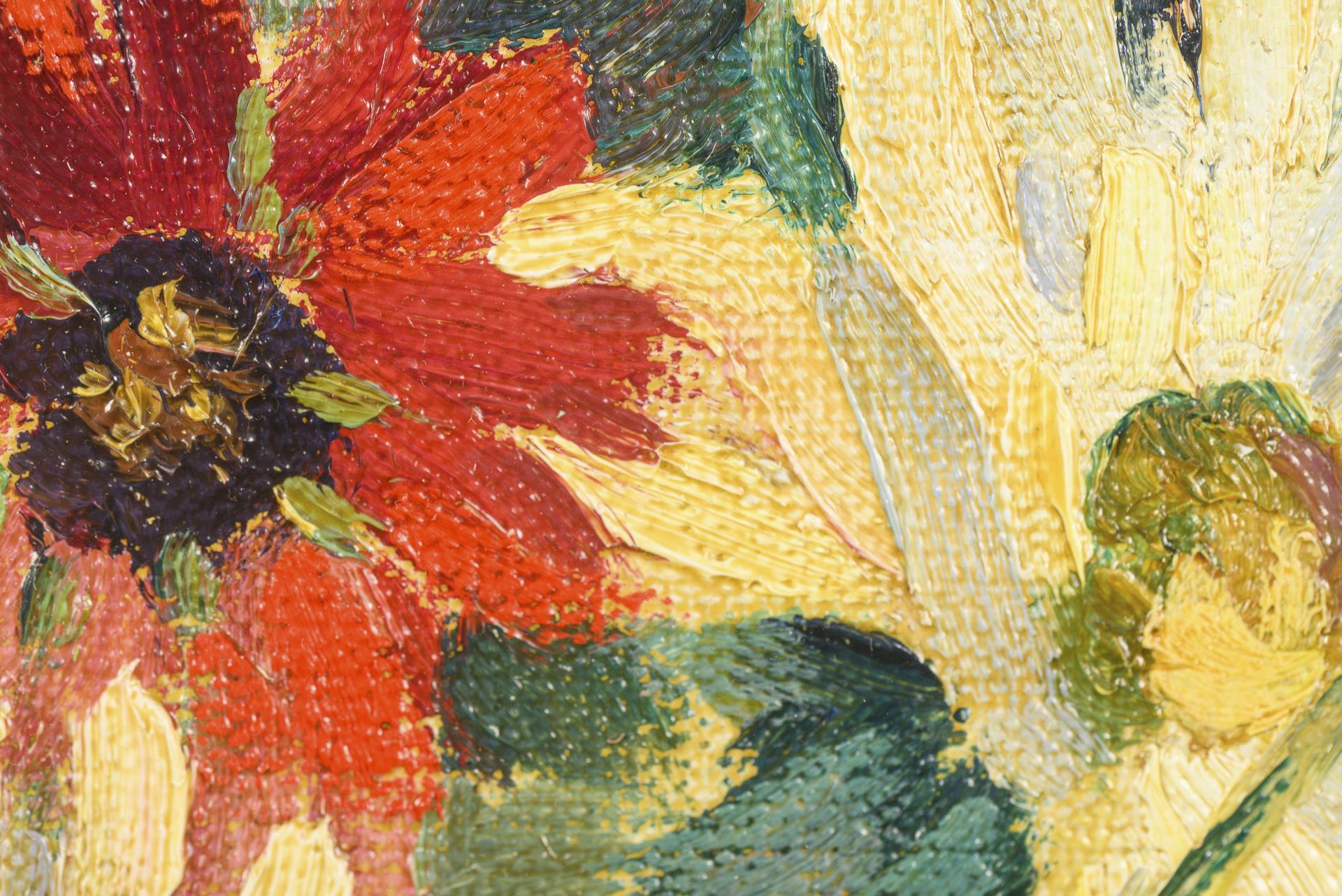 Margeriten in verschiedenen Farben in heller Kanne auf einem Tisch mit blauem Tuch.