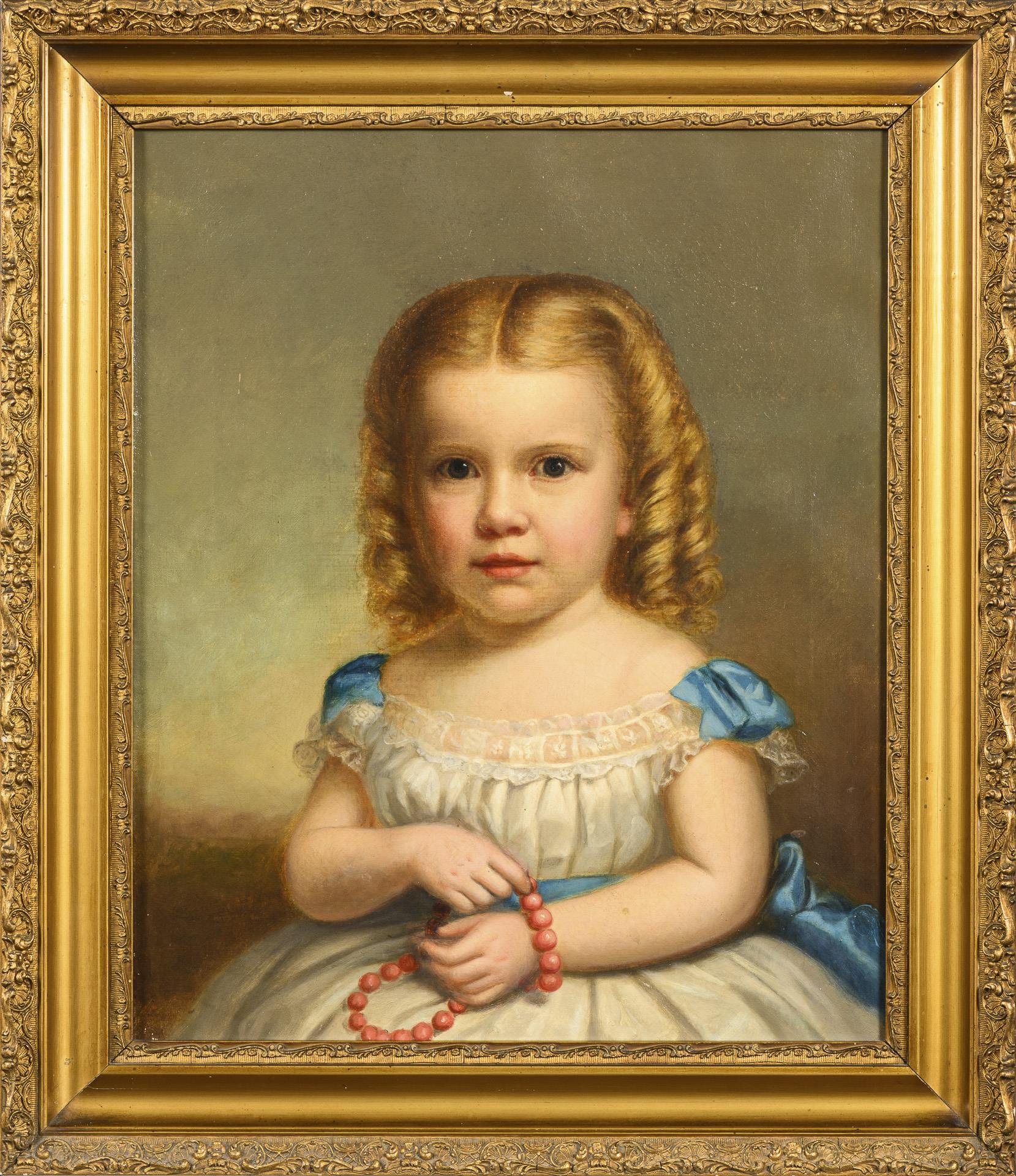 Porträt eines Kindes im weiß-blauen Kleid mit roter Perlenkette und blondem Haar. Eine kleine restaurierte Stelle mit Hinterklebung.