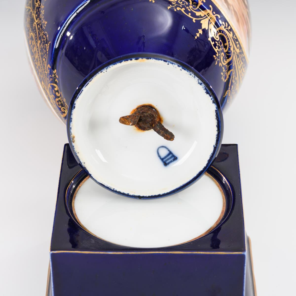 Podest. Kobaltblauer Fond, beidseitig ein Medaillon mit der Darstellung eines