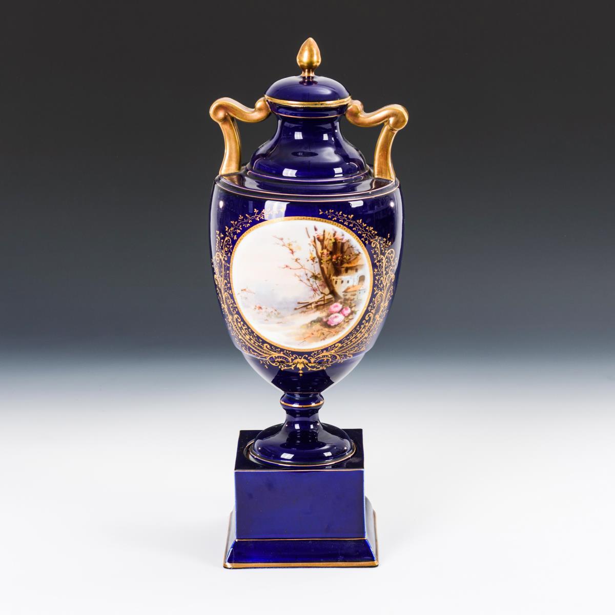 Ovoide Form mit zwei Henkeln, Knaufdeckel und Rundfuß. Mit quadratischem