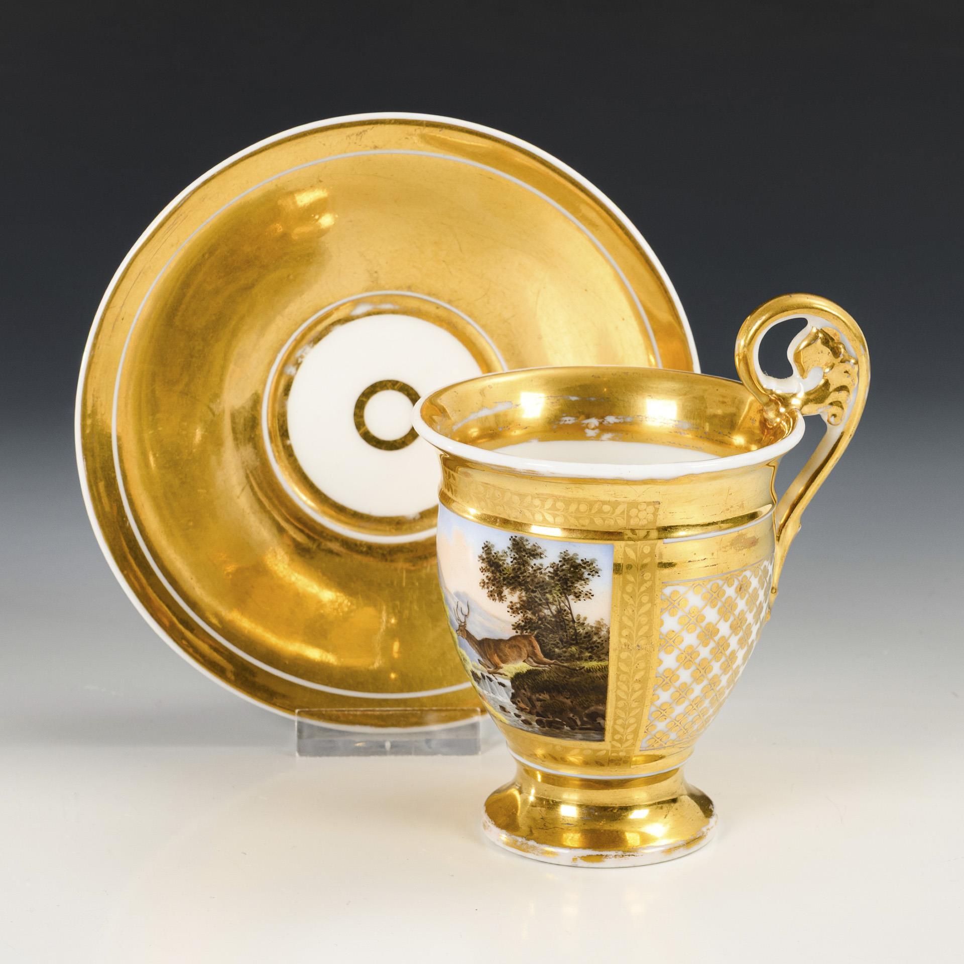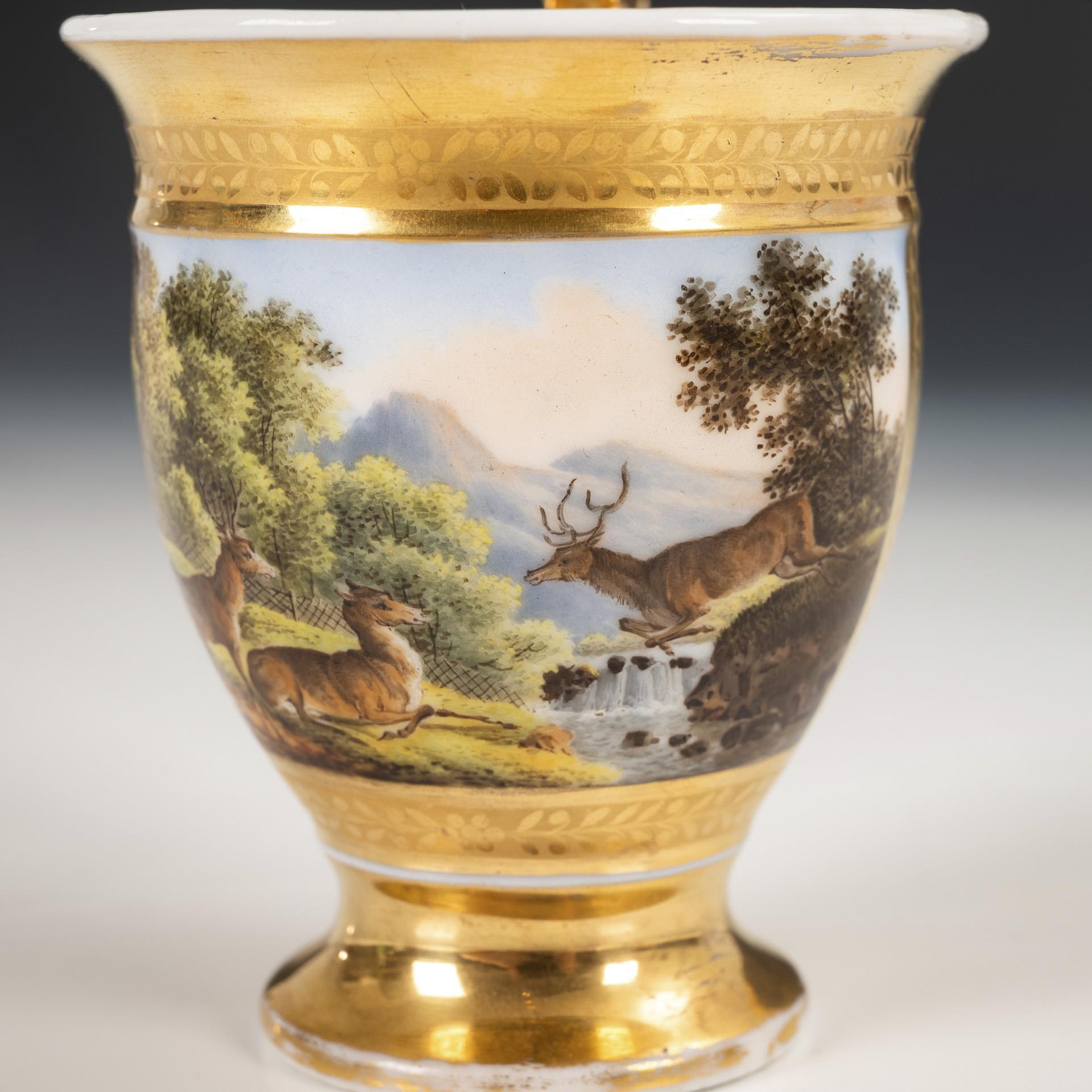 Gefußte Glockentasse mit Greifenhenkel. Schauseitig eine goldgerahmte Rechteckkartusche mit der Darstellung einer Landschaft mit zwei Hirschen und Hirschkuh, verso goldgemaltes, stilisiertes Floralmuster. Minimaler Goldabrieb.