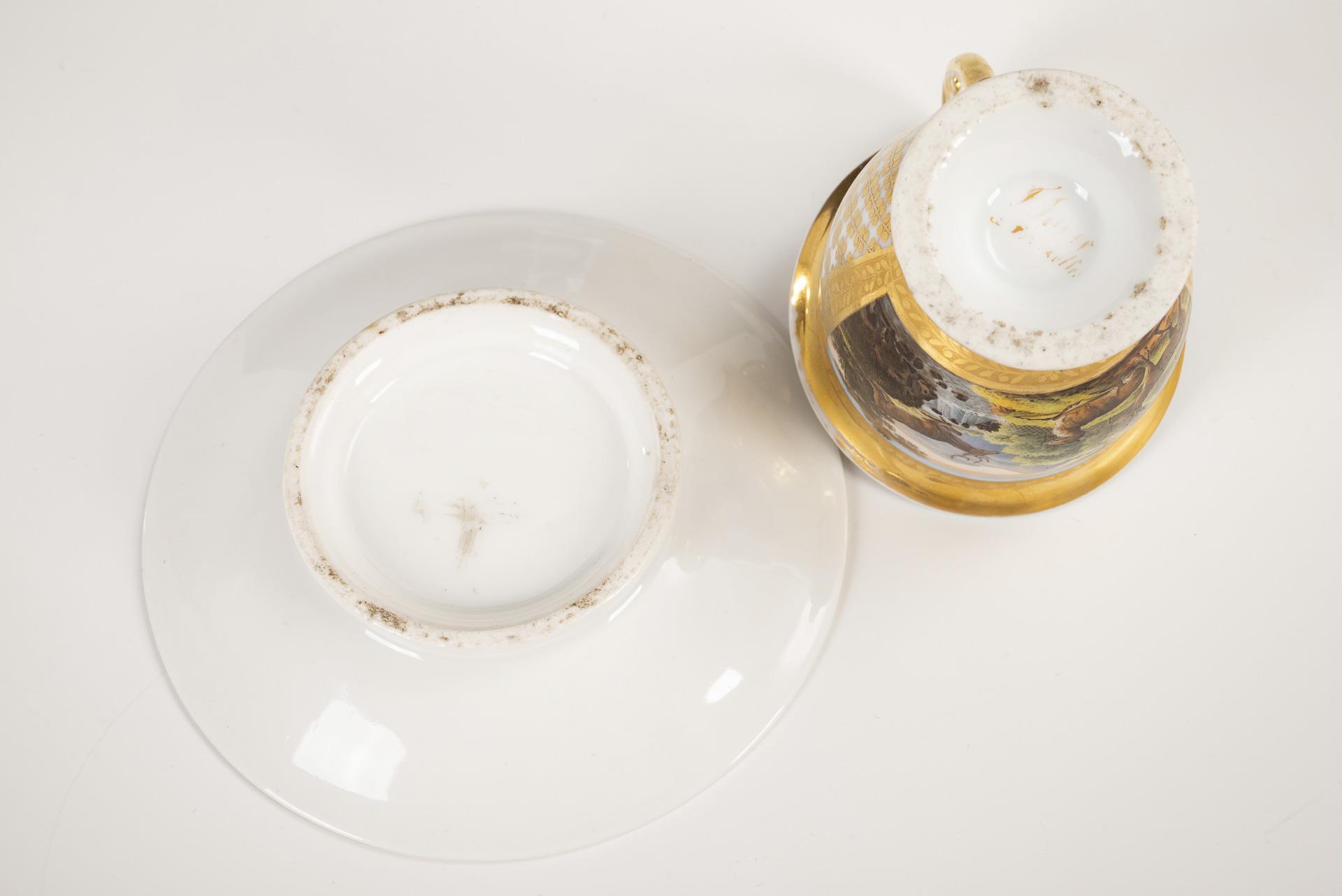 Polychrom bemalt, goldstaffiert. Tasse (H 11,5 cm), ergänzte Untertasse (Ø 13,5 cm).