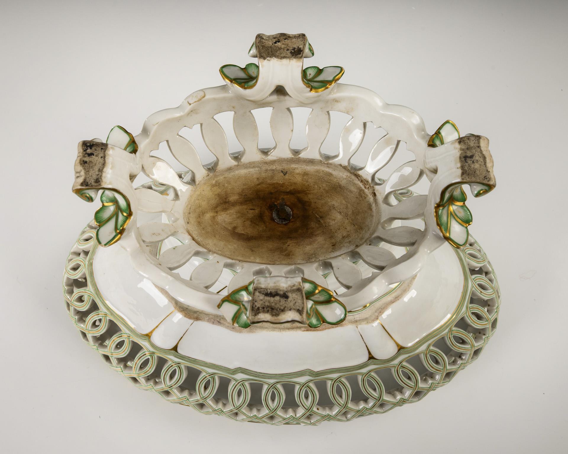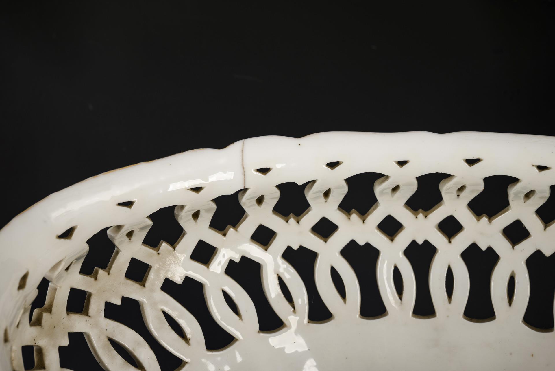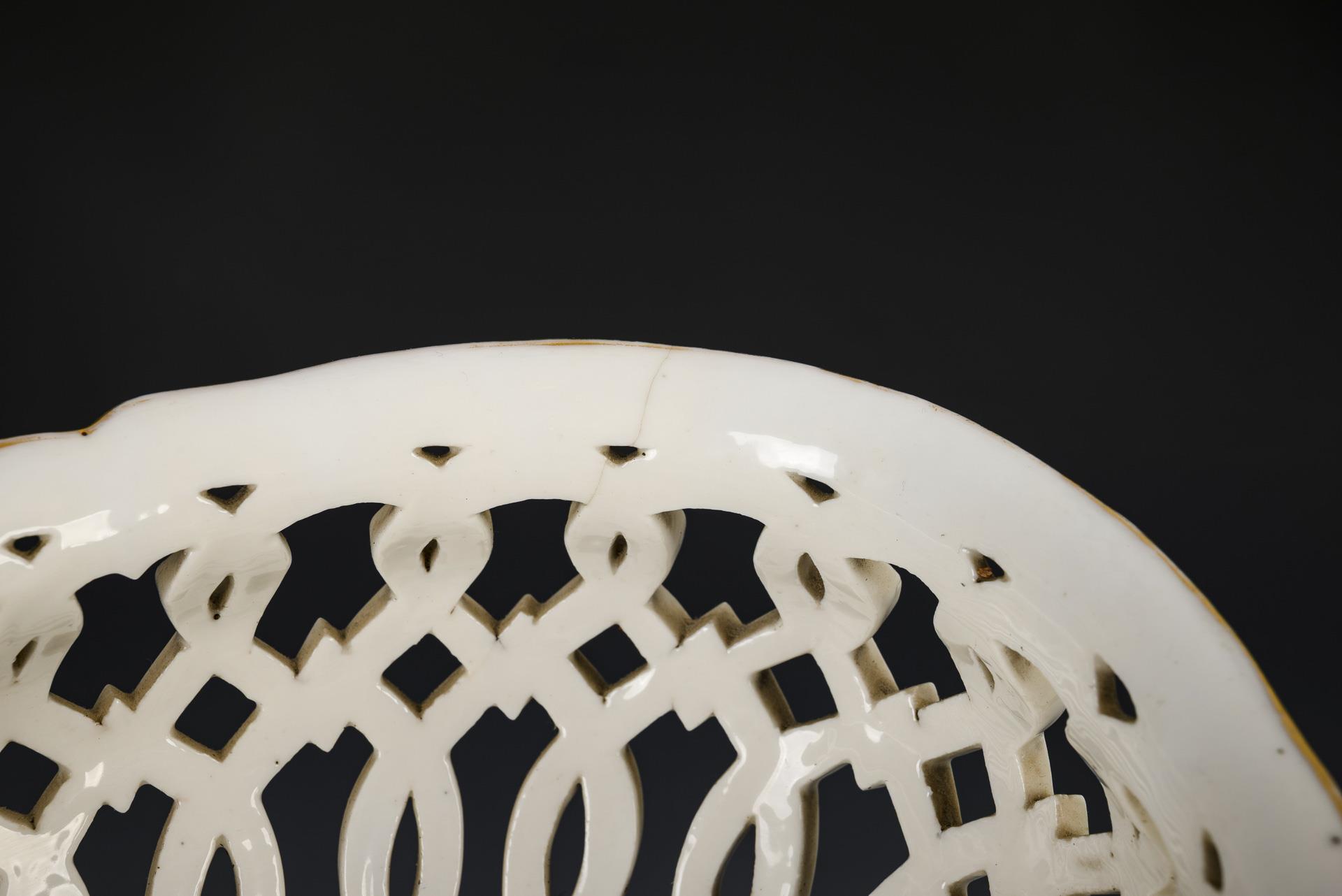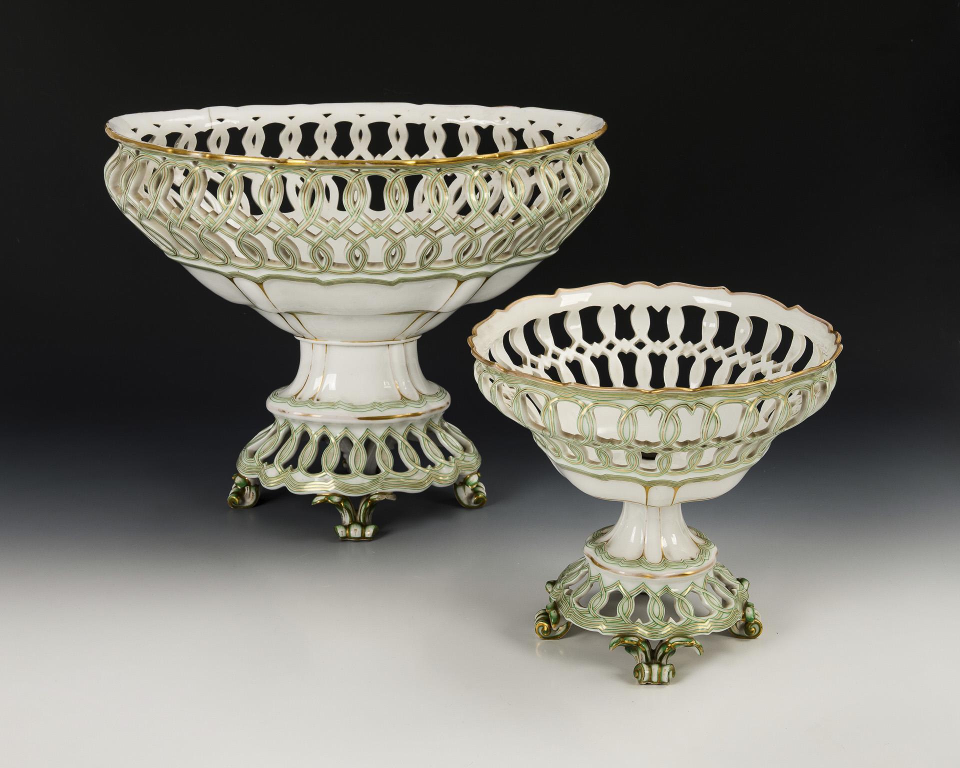 Durchbrochene Schalen, kurzer Fuß, durchbrochener Sockel mit vier gerollten Füßen, 1x ovale Form und 1x runde Form. Gold berieben, 1x 3 Randhaarrisse und 1 Blatt eines Fußes bestoßen.