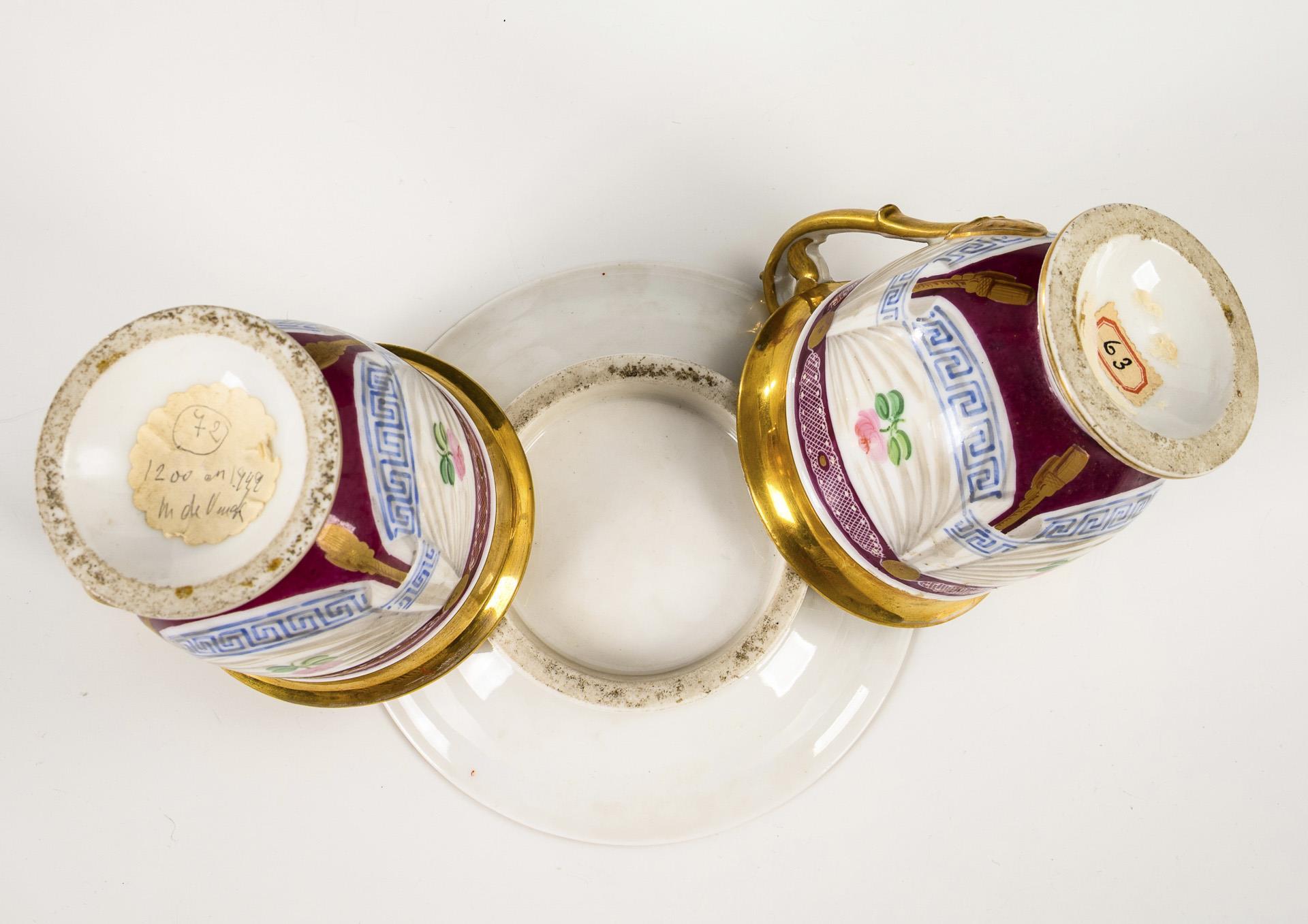 Polychrom bemalt, goldstaffiert. 2 Tassen (H 10,5 cm), 1 originale Untertases (Ø 13 cm).