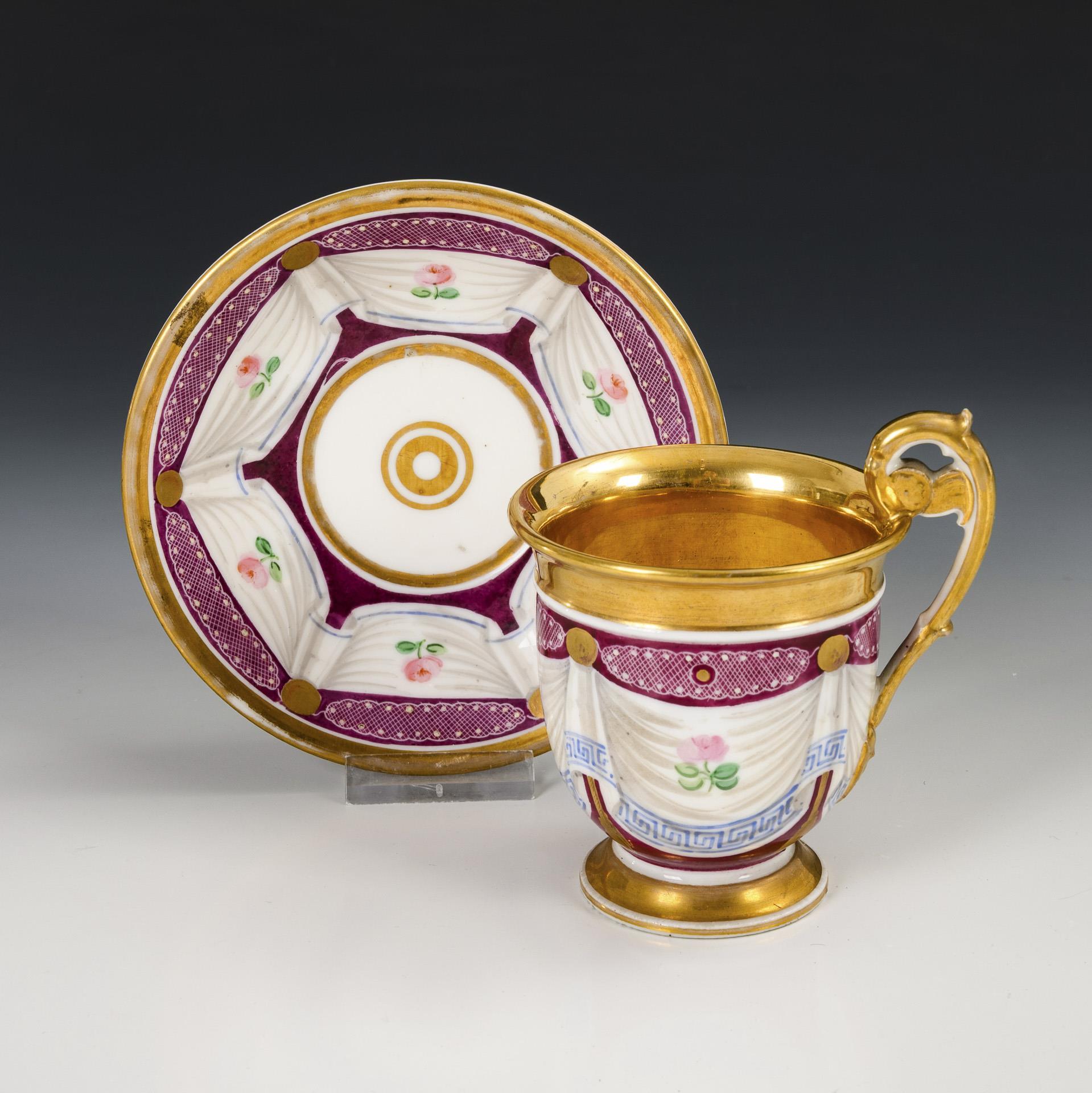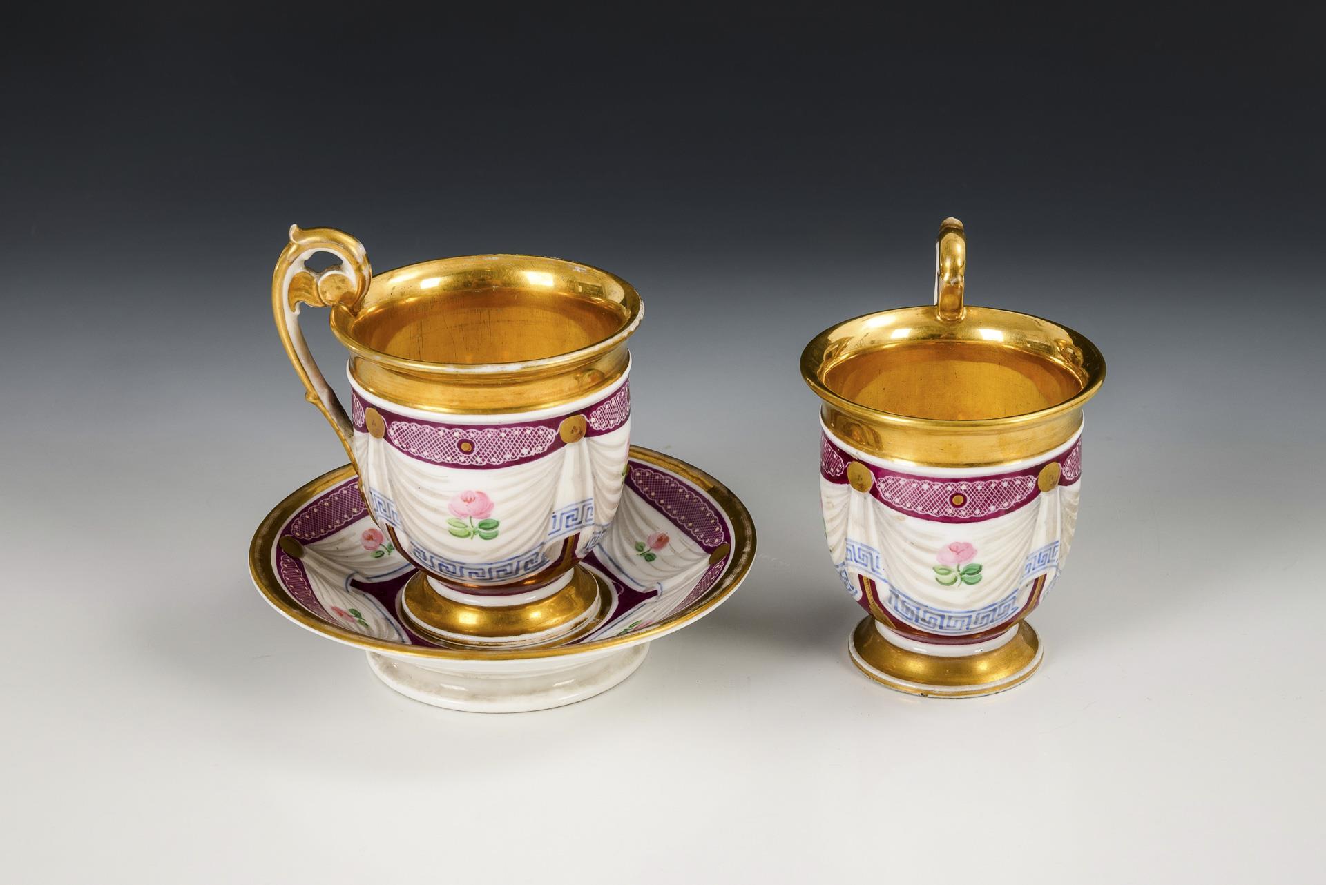 Gefußte Glockentassen mit Rosettenhenkel. Umalufend eine Tuchdraperie mit Mäanderbordüre und Rosen, goldener Teilfond. Partiell minimaler Goldabrieb.