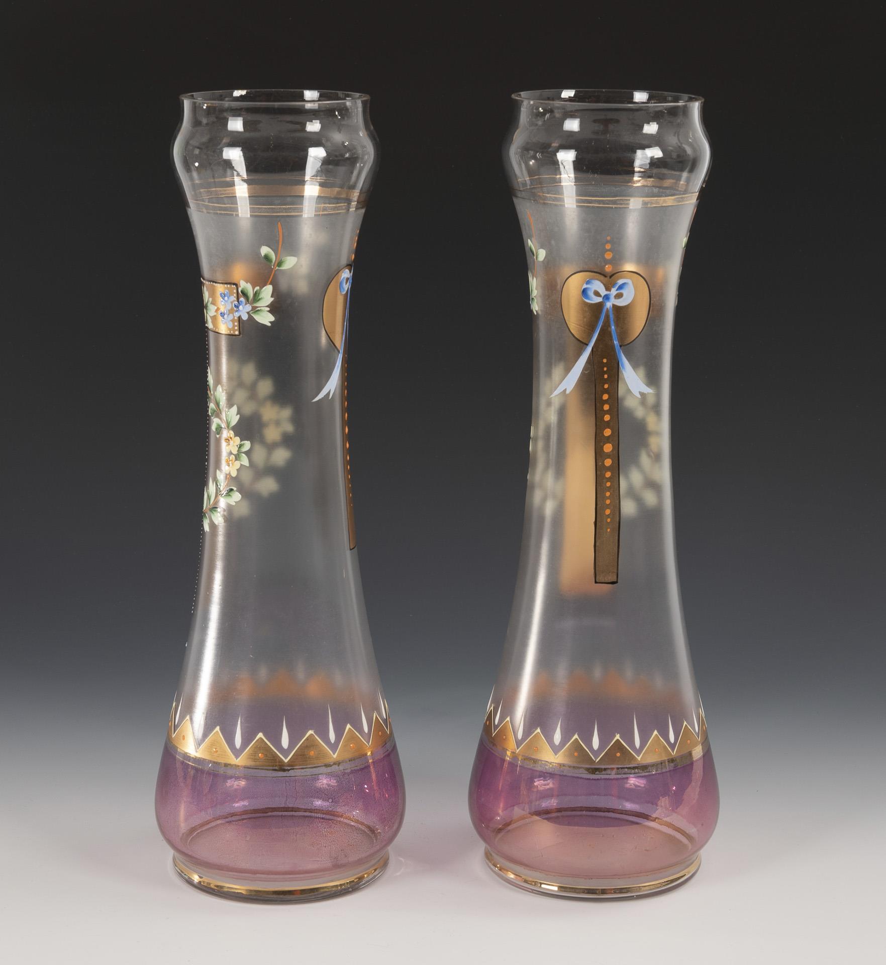 Hohe Vasen aus farblosem, teils irisiertem Glas mit transparentrosa Fondband am Stand sowie schauseitigen Goldbändern und polychromer Floralmalerei. Minimale Bestoßungen am Mündungsrand, minimaler Goldabrieb.