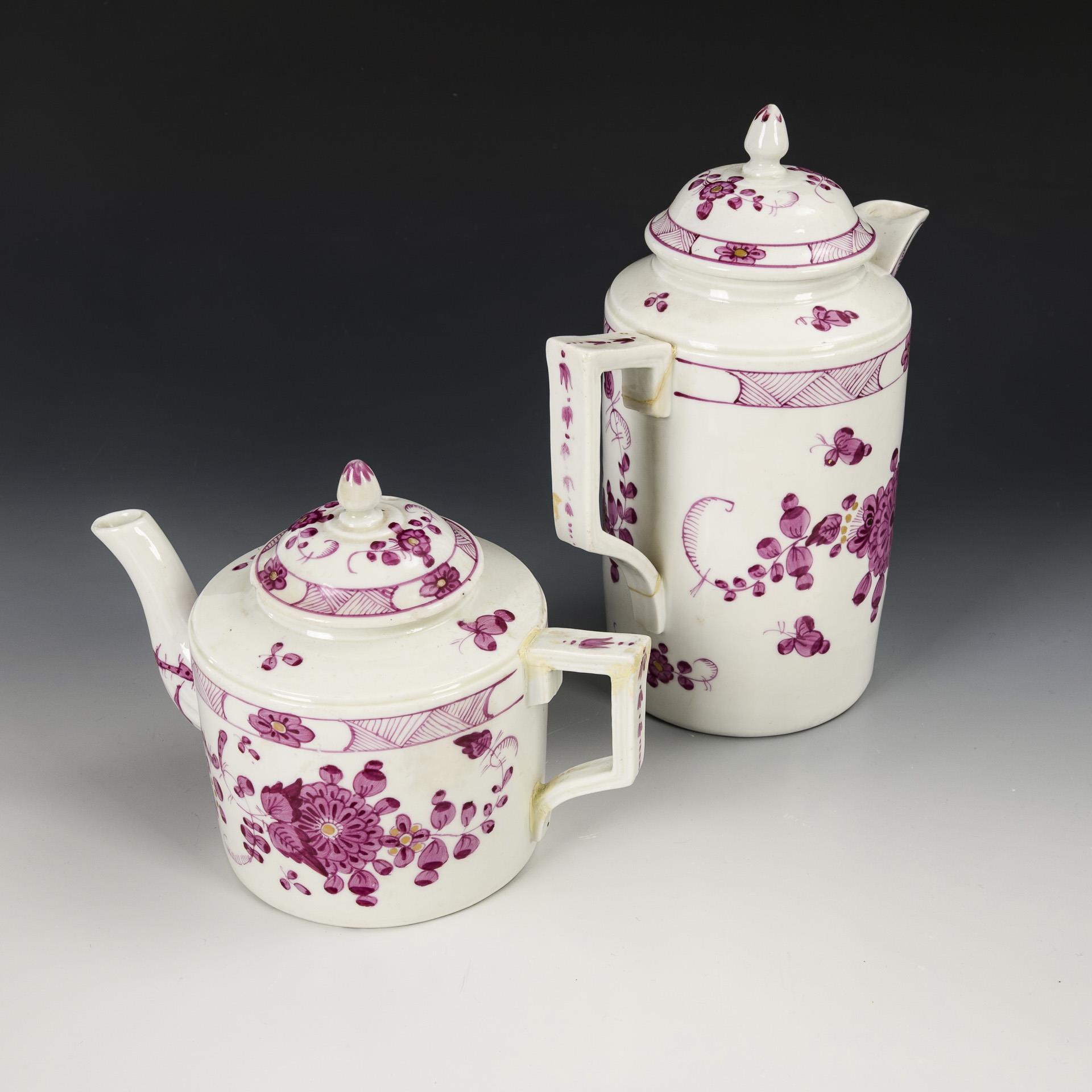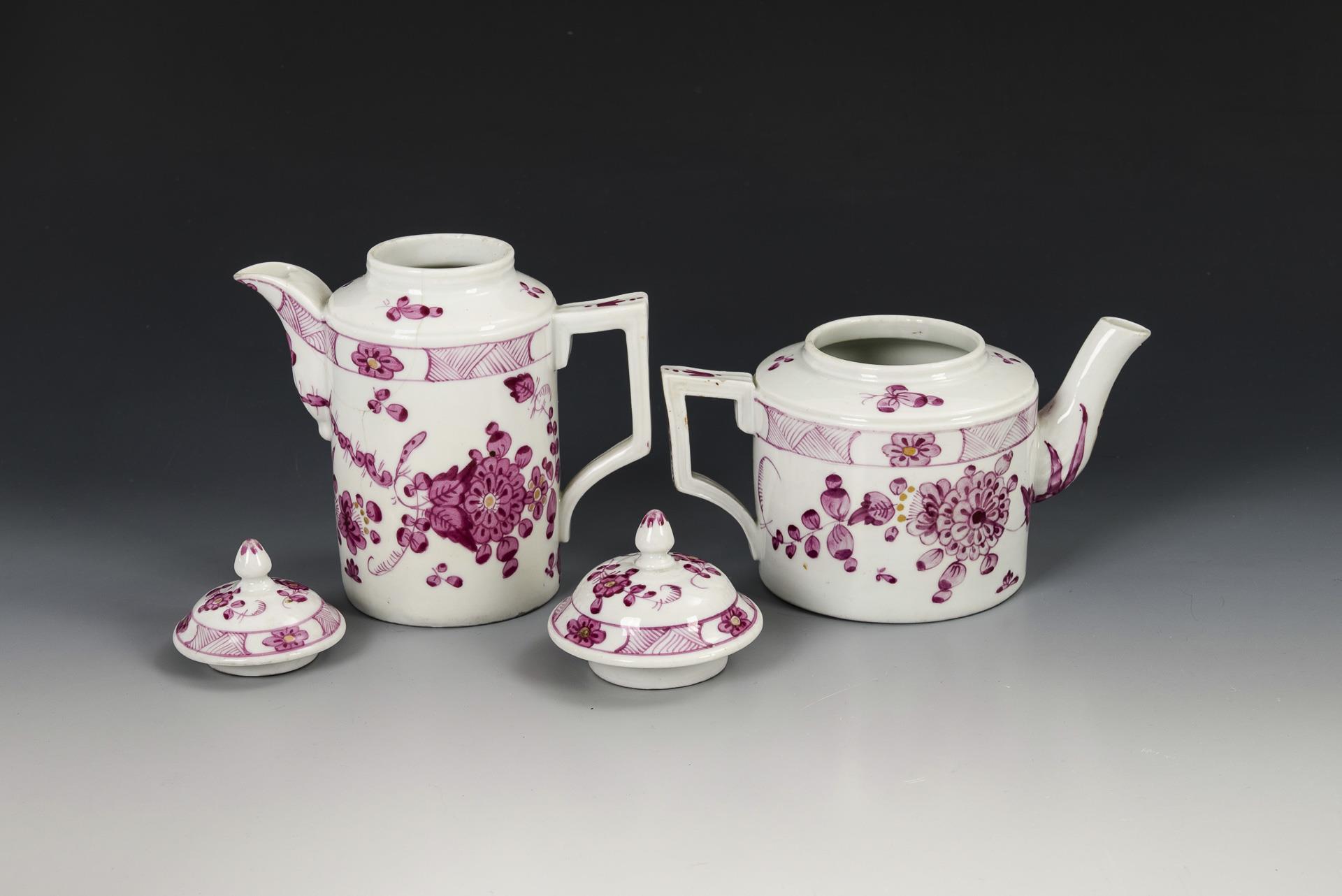 2 Kaffee- und 2 Teekannen (H 11,5-21,5 cm; davon 1x ohne Deckel), 5 Zylindertassen (H ca. 6 cm), 2 Glockentassen (H 6,5 und 7 cm) und 6+3 Untertassen (Ø 12 und 13 cm) und 1 Quadratschälchen (13,5 x 14 cm). Teils berieben, 3 Untertassen mit Randbestoßung, 1 Untertasse mit Haarriss, 1 Untertasse und 1 Kaffeekännchen mit Haarrissspinne, 1 Kaffeekanne und 1 Teekanne Henkel geklebt, Chip an 1 Tassenrand.