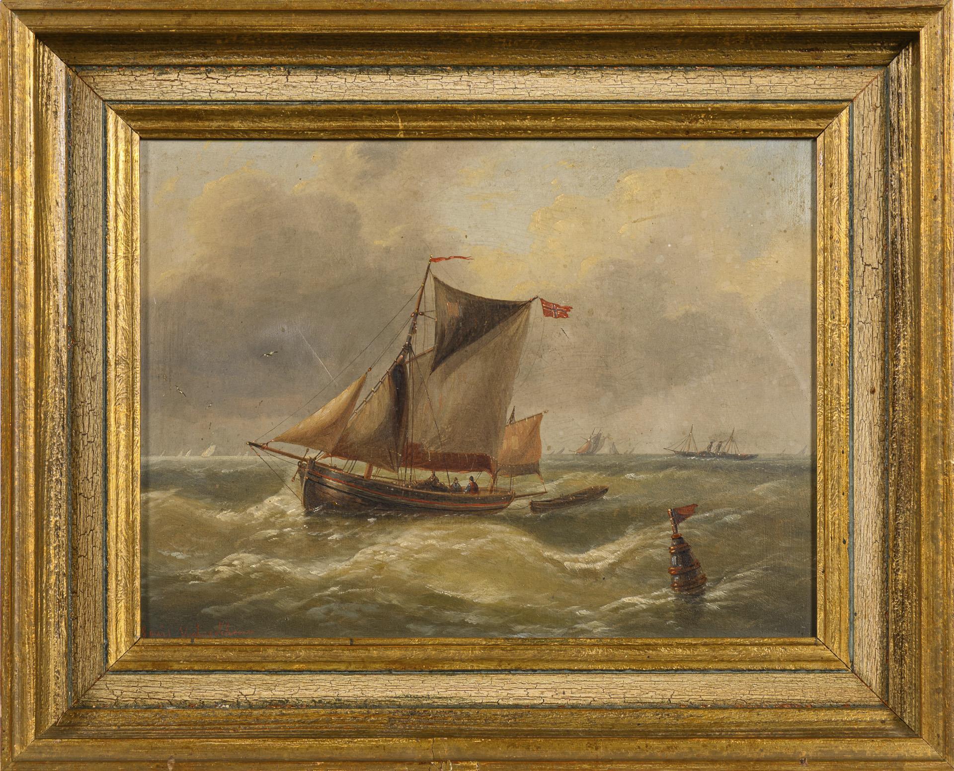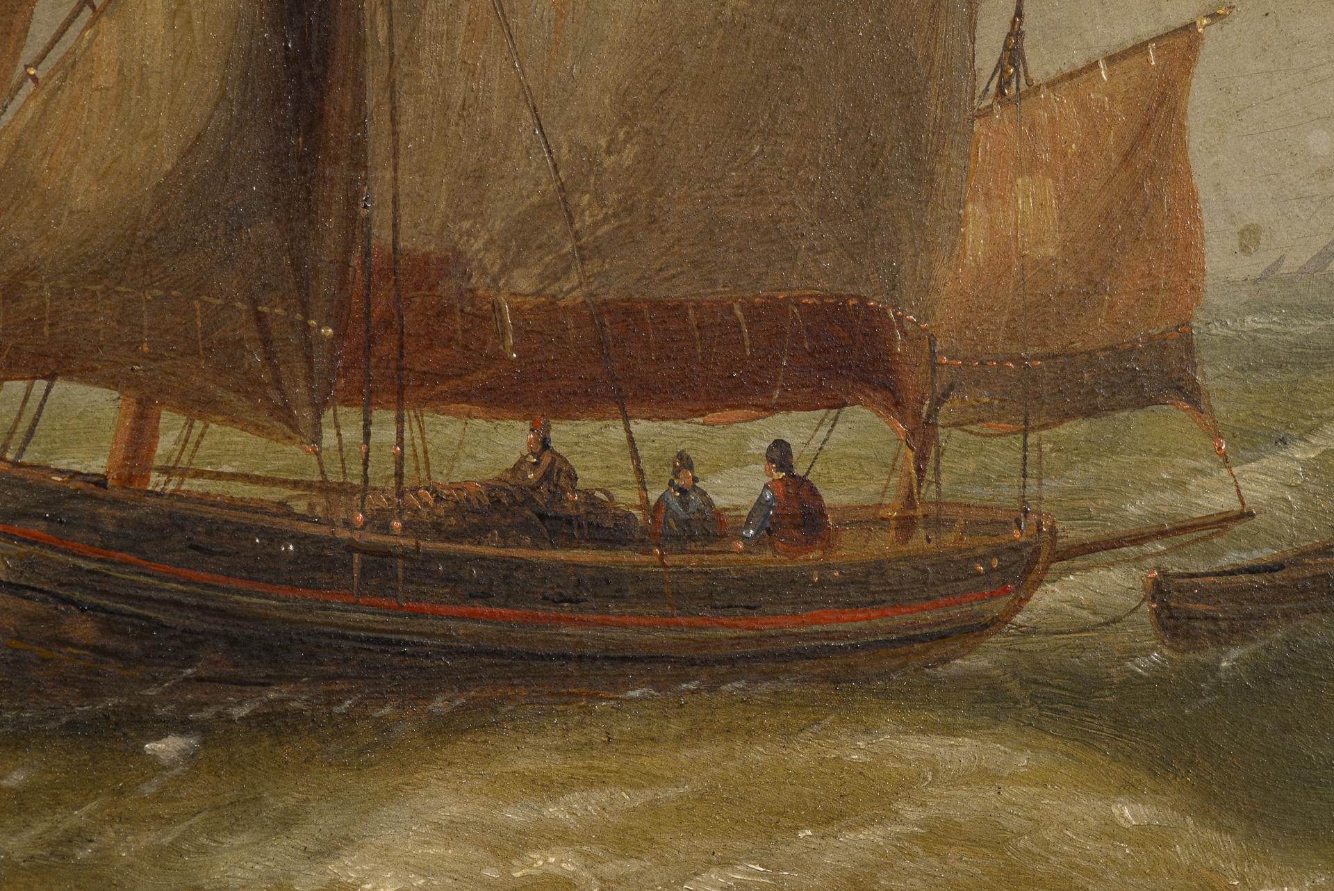 Mehrere Segelschiffe auf dem bewegten Wasser unter wolkigem Himmel.