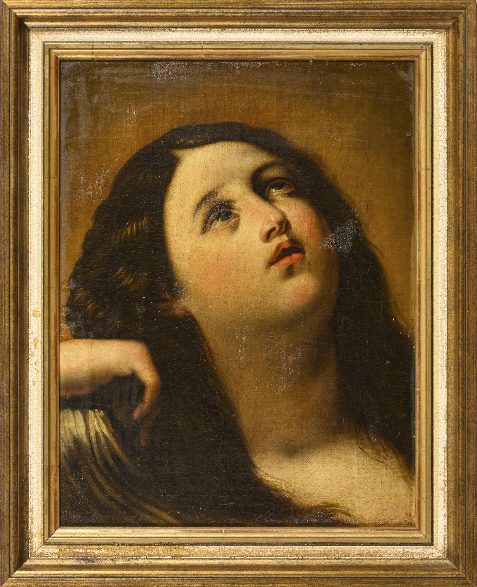 Porträt einer jungen Frau mit zum Himmel gerichtetem Blick, bei der es sich wahrscheinlich um Maria Magdalena handelt. Altersspuren, beschnitten.