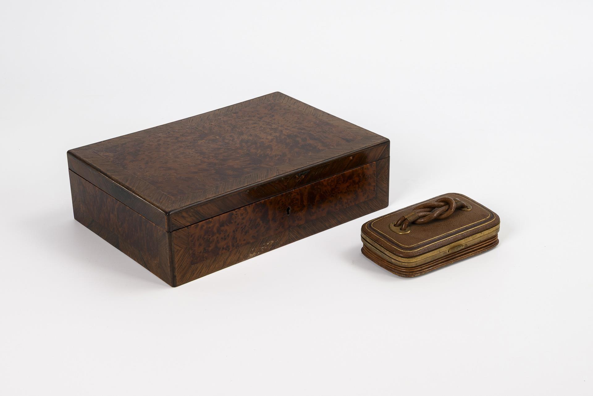 Maserholz und Rosenholz furniert. Lederetui mit Messingmontierung. 7 x 24 x 17 cm bzw. 4 x 11 x 7 cm. Gesamt 1,3 kg.