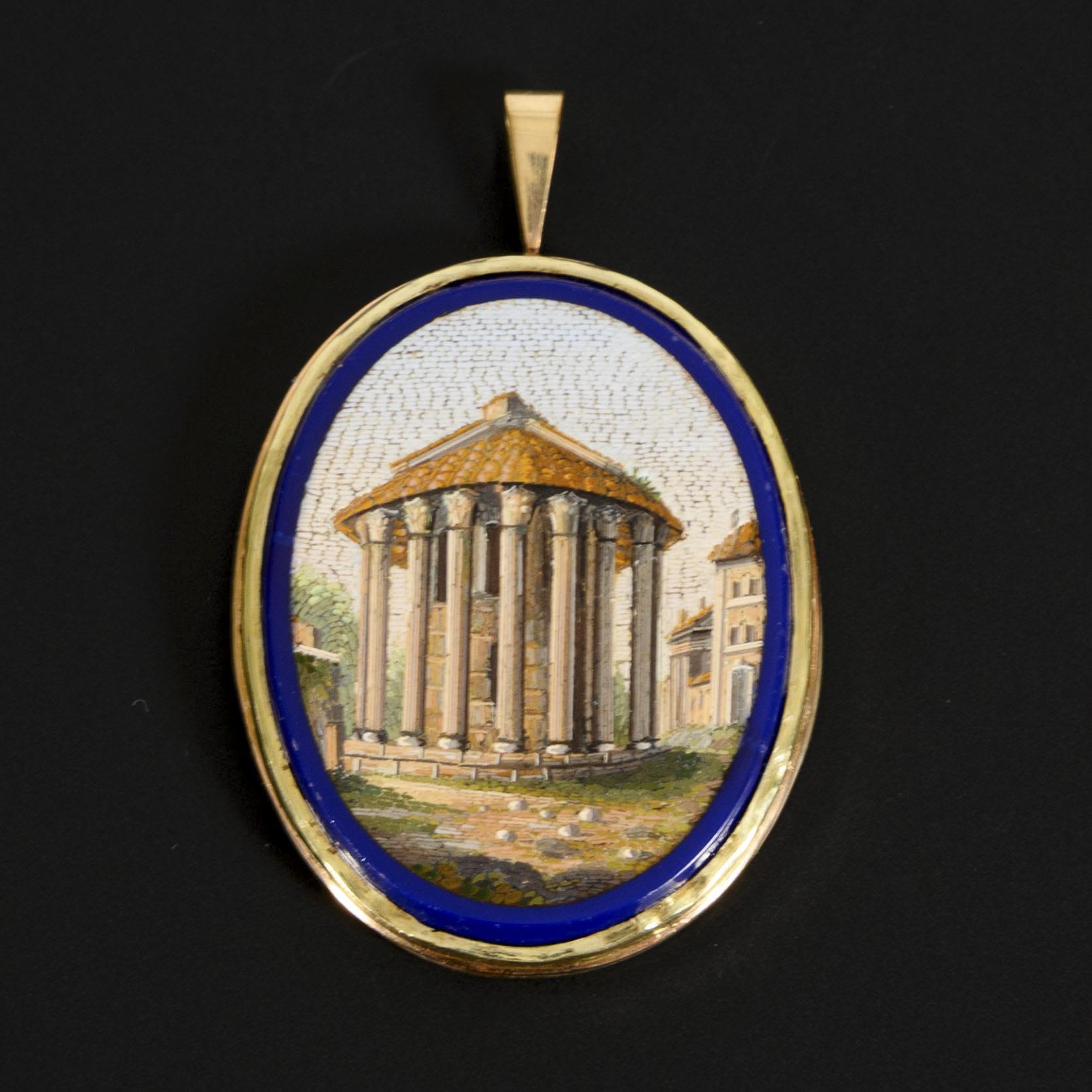 Anhänger mit qualitätvoller Mikromosaik-Darstellung des Tempels des Hercules Victor (auch als "Rundtempel am Tiber" bekannt) auf dem Forum Boarium in Rom. Die Öse ist starr.