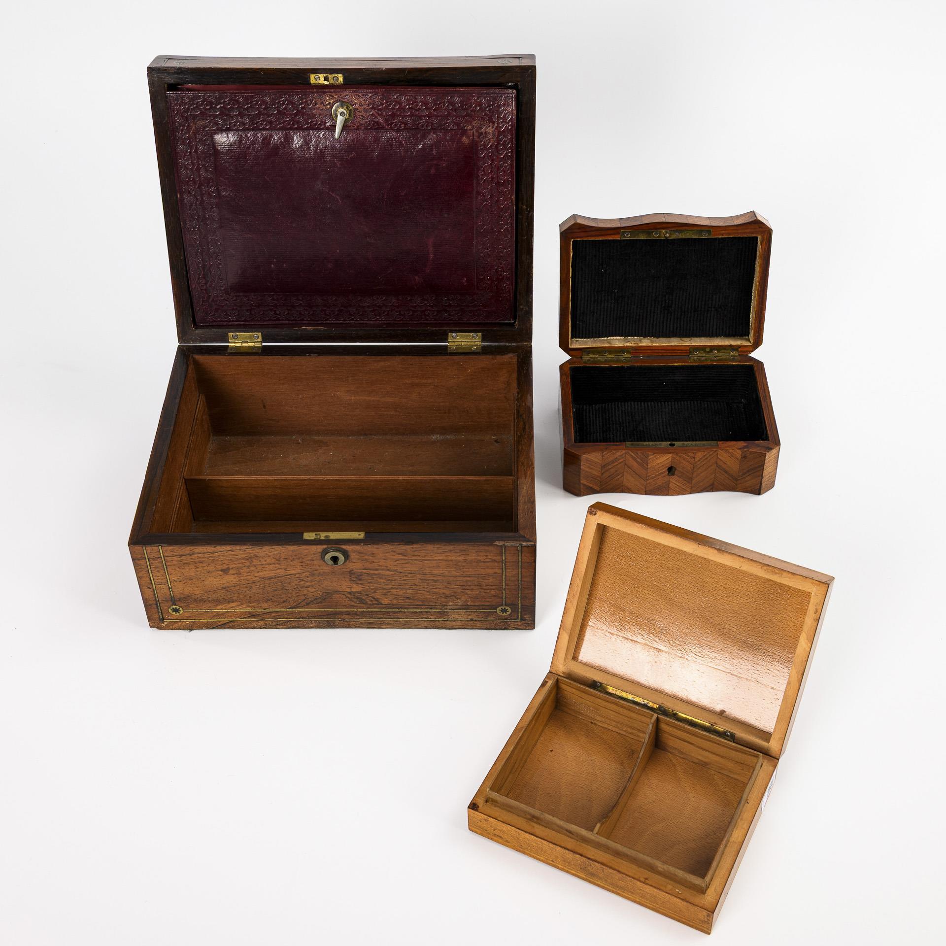 Dokumentenschatulle Rosenholz furniert mit Messing-Fadeneinlagen und leerer Messing-Kartusche. Im Scharnierdeckel Dokumentenfach aus Karton mit goldgeprägtem Leder. Im Korpus Binnenfachung (herausnehmbares Fach fehlt). / "Tahan Paris" gemarkte Schatulle Rosenholz furniert sowie eingelegter Perlmutt-Rapport auf dem Scharnierdeckel; innen schwarzer Samt. / Hell furnierte Spielkartenschatulle mit Arabesken-Marketerie auf dem Scharnierdeckel. Alters-/Gebrauchsspuren (geringe Furnierfehlstellen).