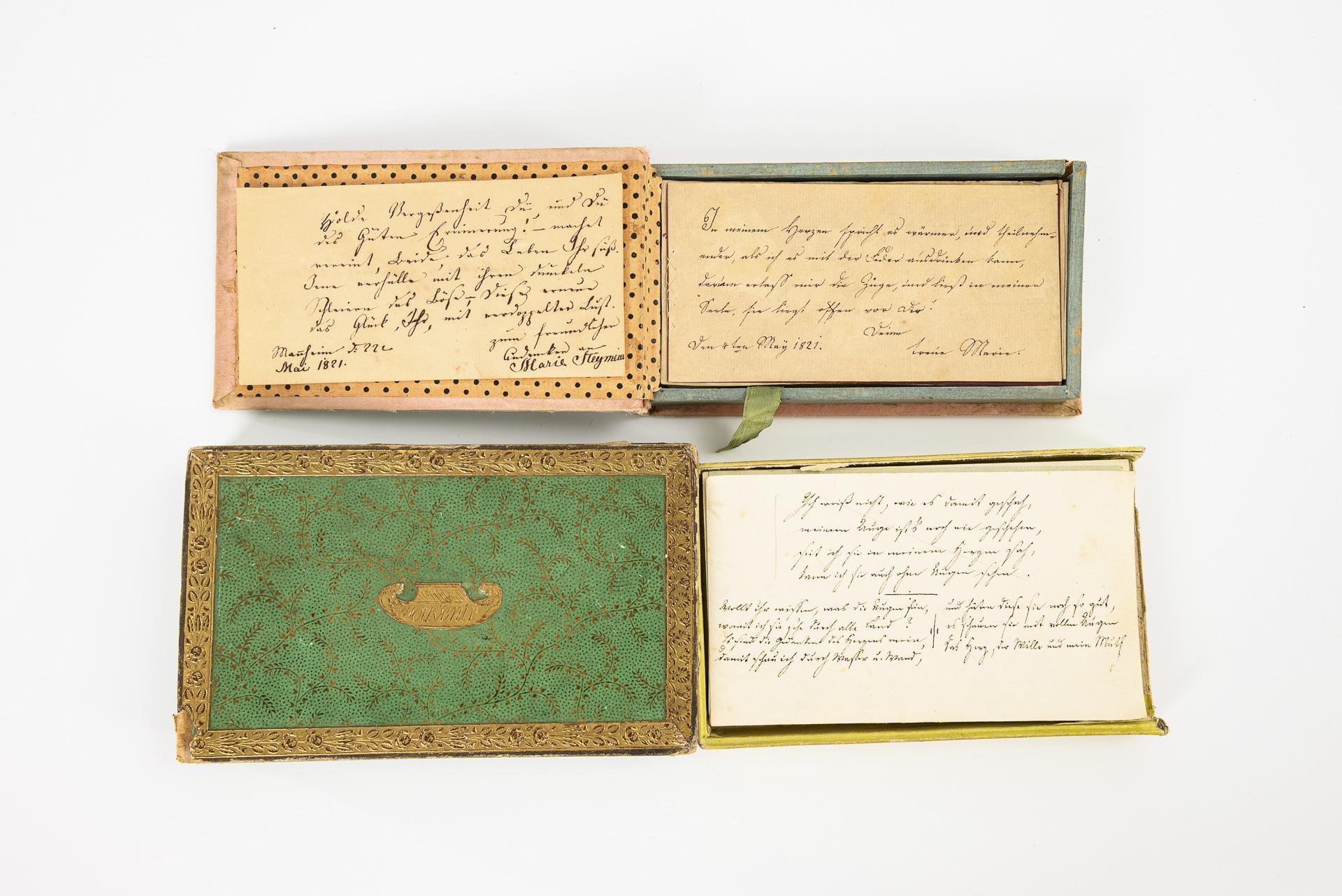Stammbuch/Freundschaftsalbum („liber amicorum“) in Schatullenform bzw. Buchform; auf dem Buchrücken "Souvenir pour l'Amitie". In der Schatulle hälftig unbeschriebene und beschriebene lose Blätter zwischen 1835 und 1848, häufig mit Gedichten. In der Buchschatulle zahlreiche beschriebene Blätter zwischen 1813 und 1826, darunter 3 Aquarelle und 1 Bleistiftzeichnung (je Blumen). 1 fehlende Wandung am Innenschub, je Alters-/Gebrauchsspuren.