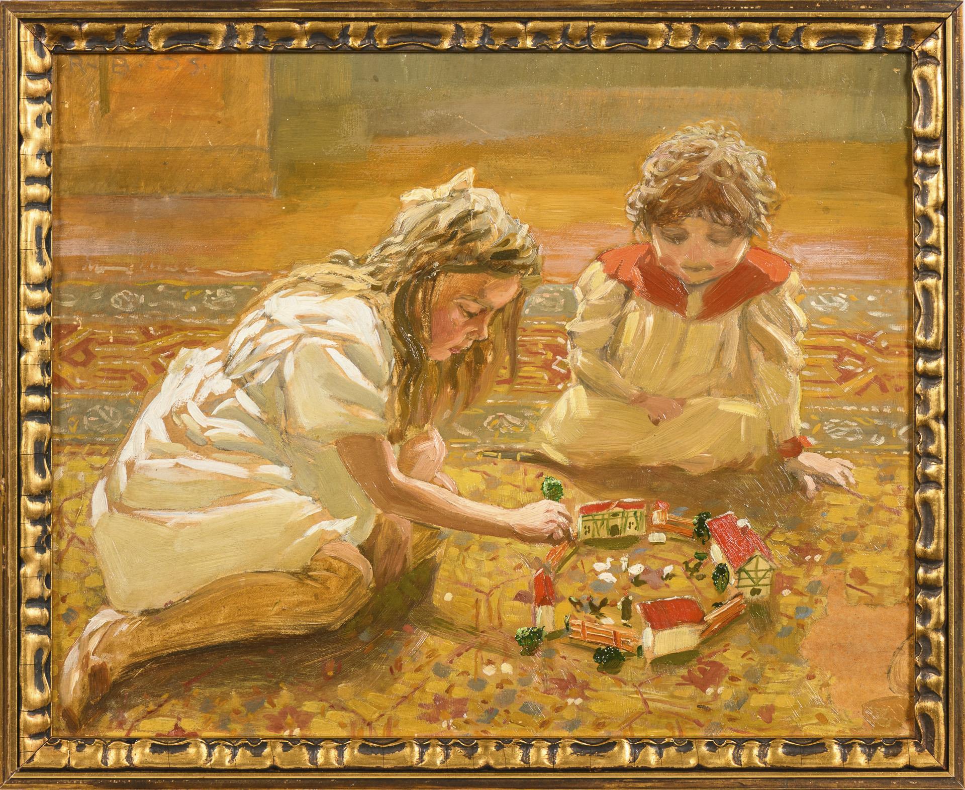 Die beiden Kinder auf dem Teppich beim Spielen mit den Tierfiguren am kleinen Bauernhof.