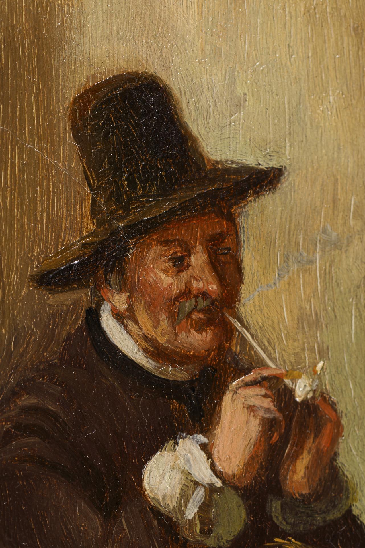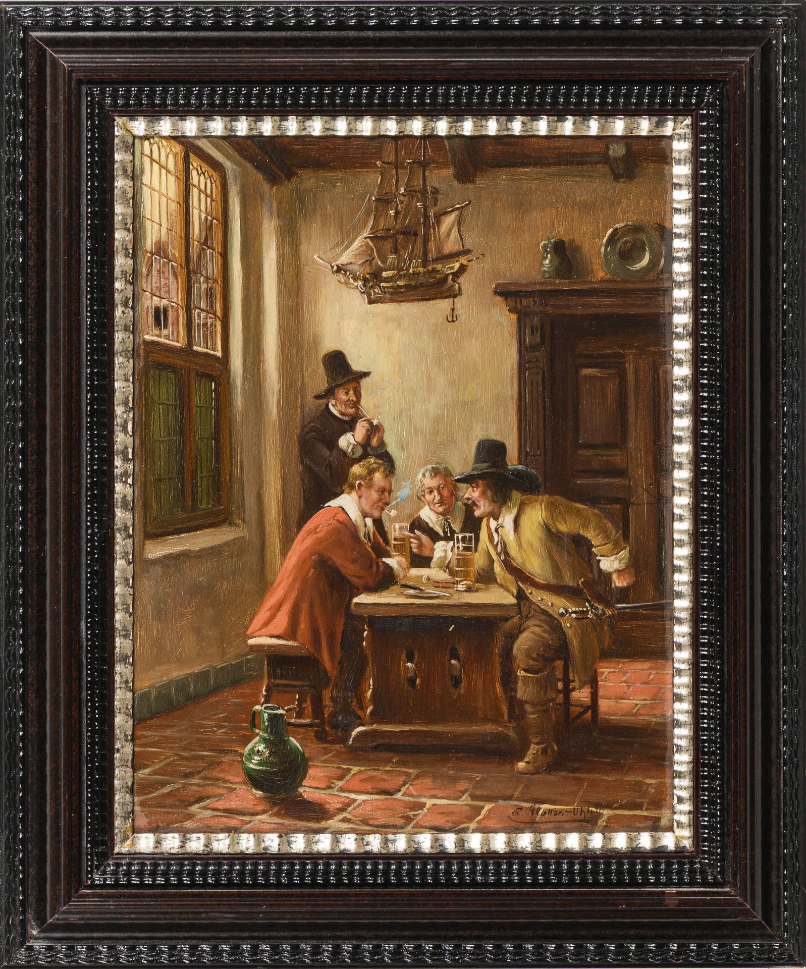 Vier Männer beim Diskutieren und Pfeife rauchen an einem Tisch in holländischer Stube.