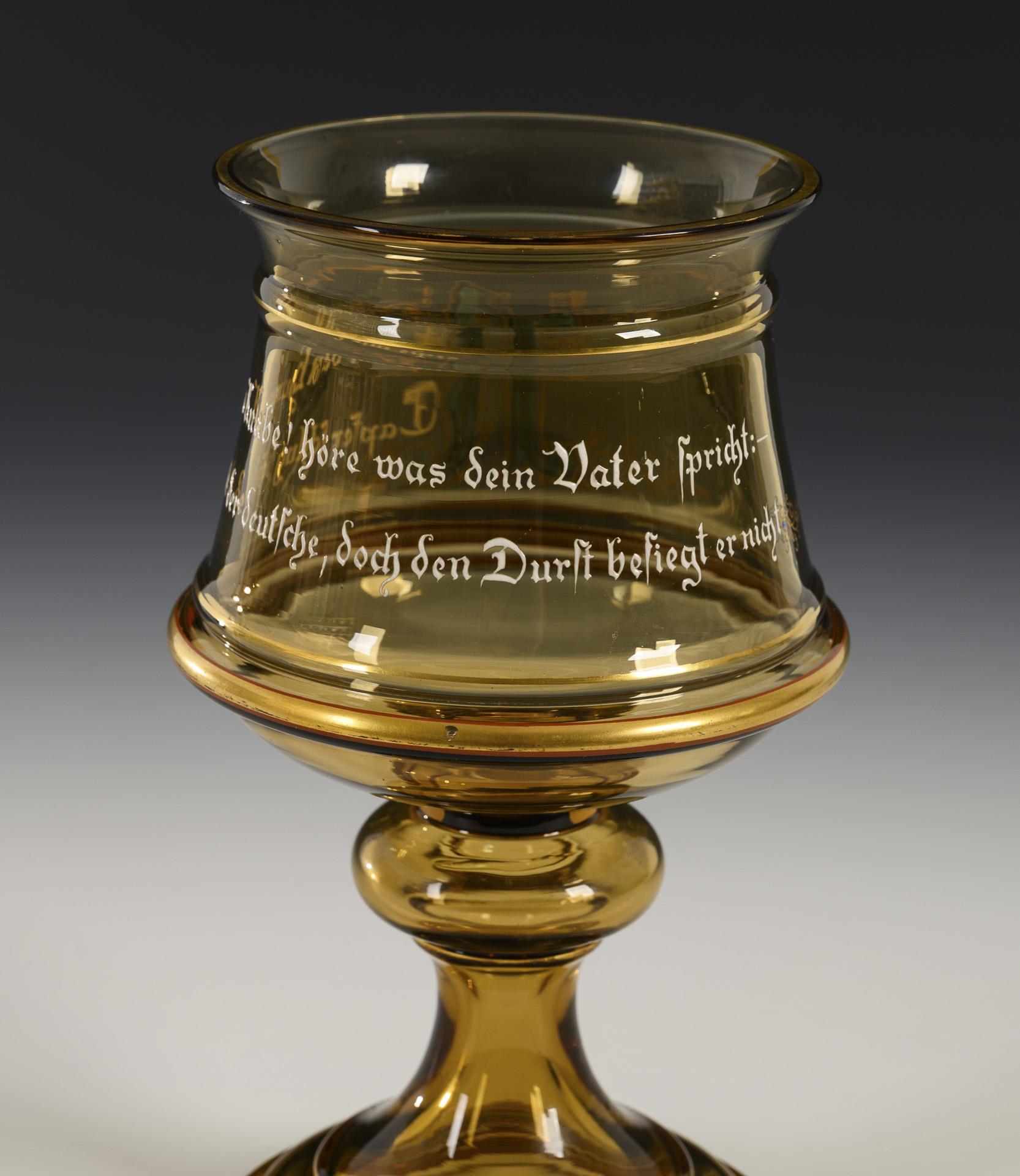 Kelchglas, auf der Kuppa der emailgeschriebene Spruch "Reiche mir den Humpen Knabe! höre was dein Vater spricht: - Tapfer schlug sich stets der deutsche, doch den Durst besiegt er nicht.".