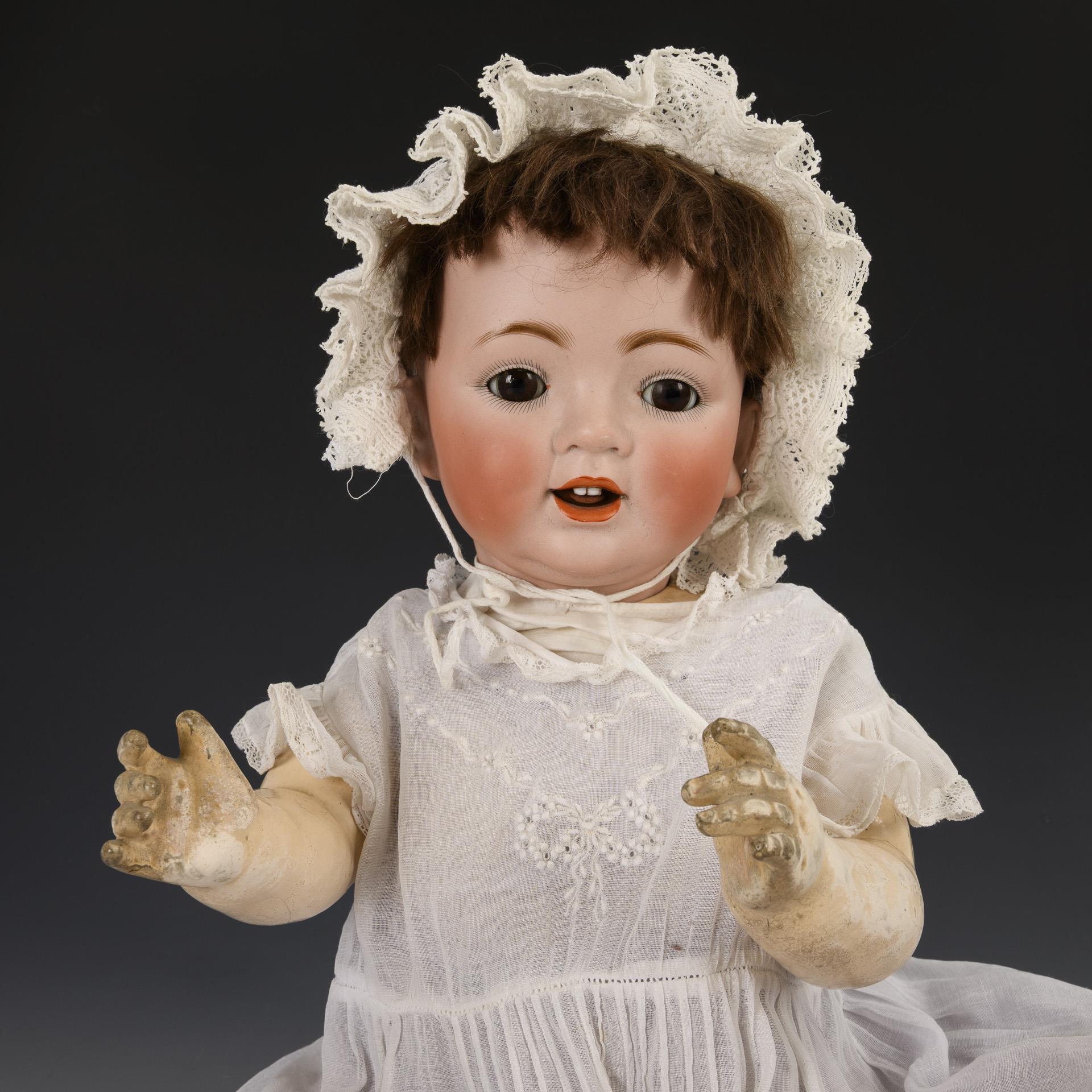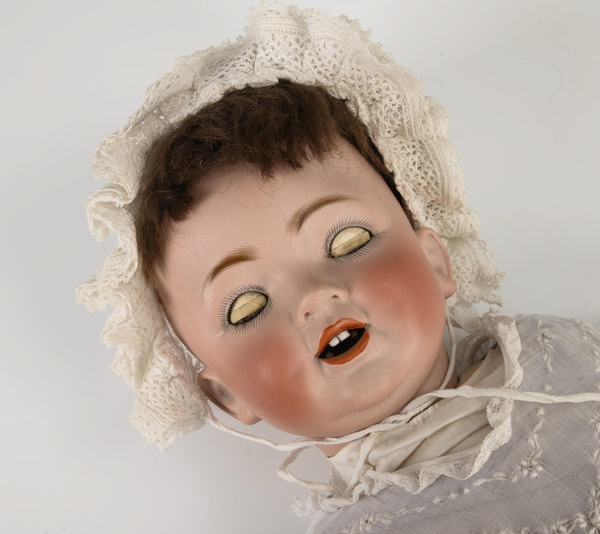 Kurbelkopf mit braunen Schlafaugen, geöffnetem Mund und beweglicher Zunge sowie brauner Mohairperücke. 5-teiliger Sitzkörper mit weißer Kleidung. Kopf durchleuchtet: ohne Defekte, Hände berieben.