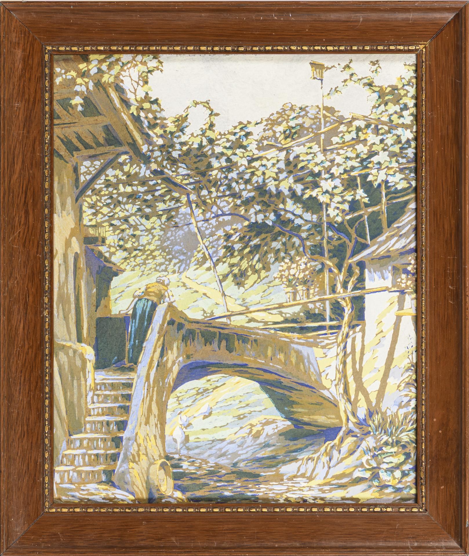 Gehöft mit kleiner Brücke über einem Bach an einem sonnigen Tag.