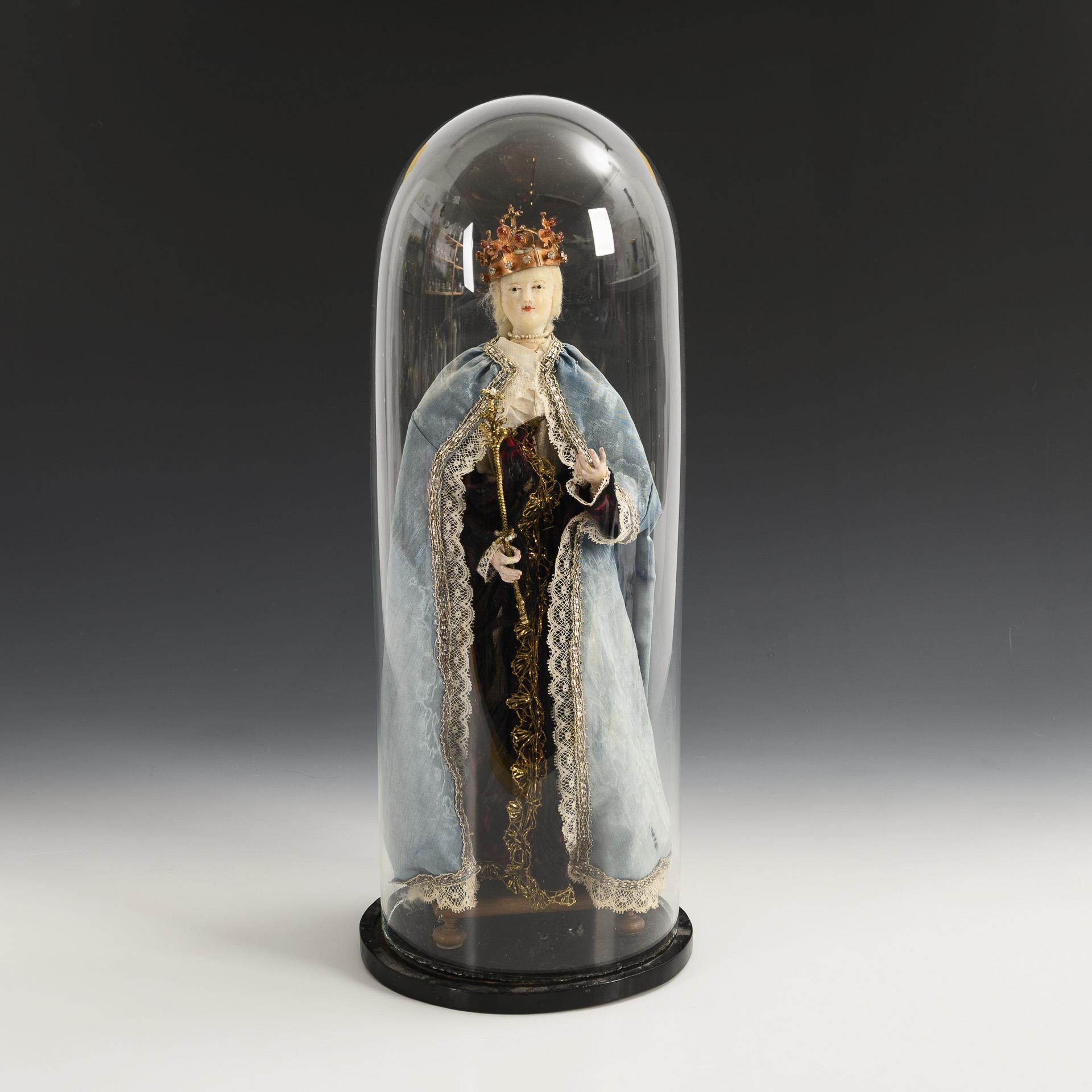 Wachskopf mit Glasaugen, blonde Mohairhaare, Holzkörper,- beine und Hände, teils bemalt, Arme aus gefüttertem Draht, massive Krone mit Glassteinen, Seidenstoff, Klosterarbeiten. Ebonisiertes Holz und Glas. H Puppe 37 cm (ohne Krone), H Dom 50 cm.