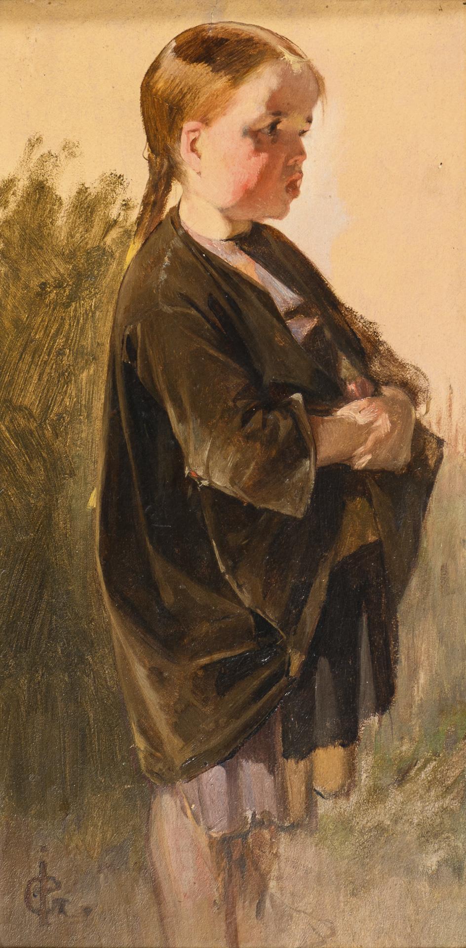 Skizze eines Mädchens mit verschränkten Armen im Sonnenschein. Ein Riss am Rand.