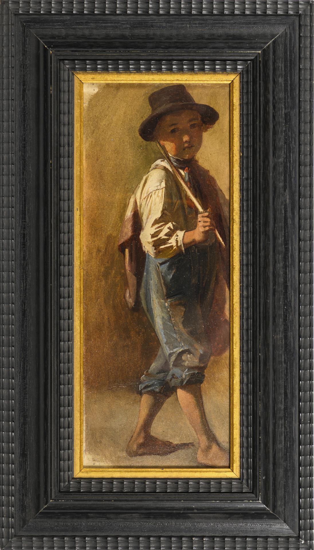 Junge mit hochgekrempelten Hosen, Jacke und Stock im Sonnenlicht. Nagellöcher in den Ecken.