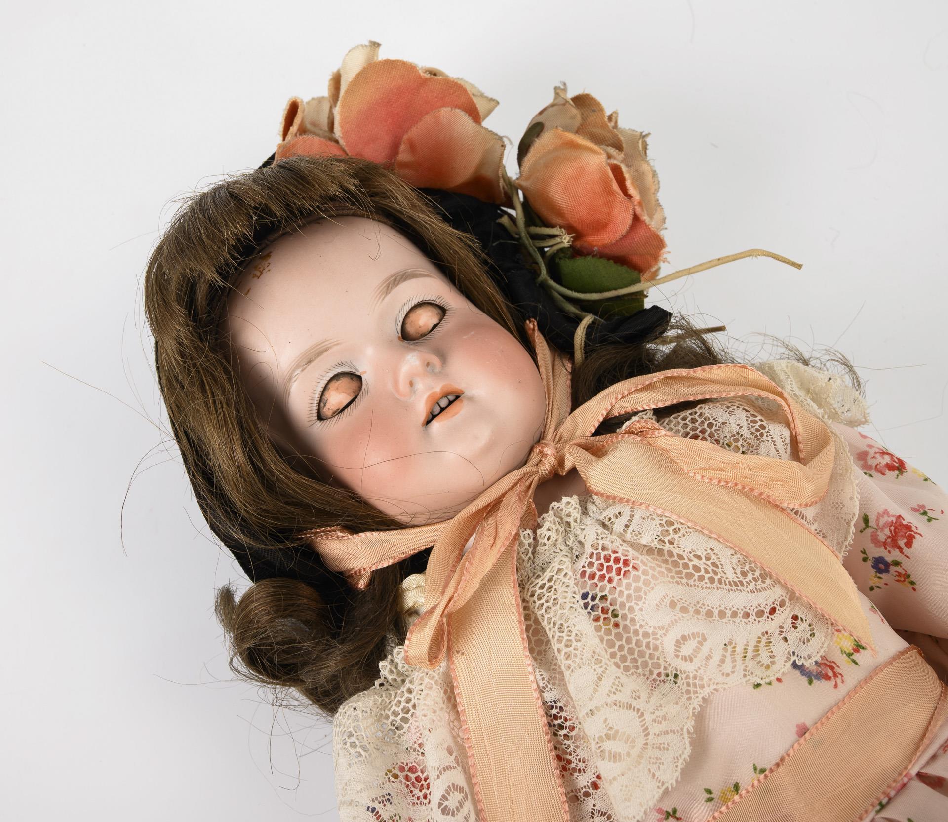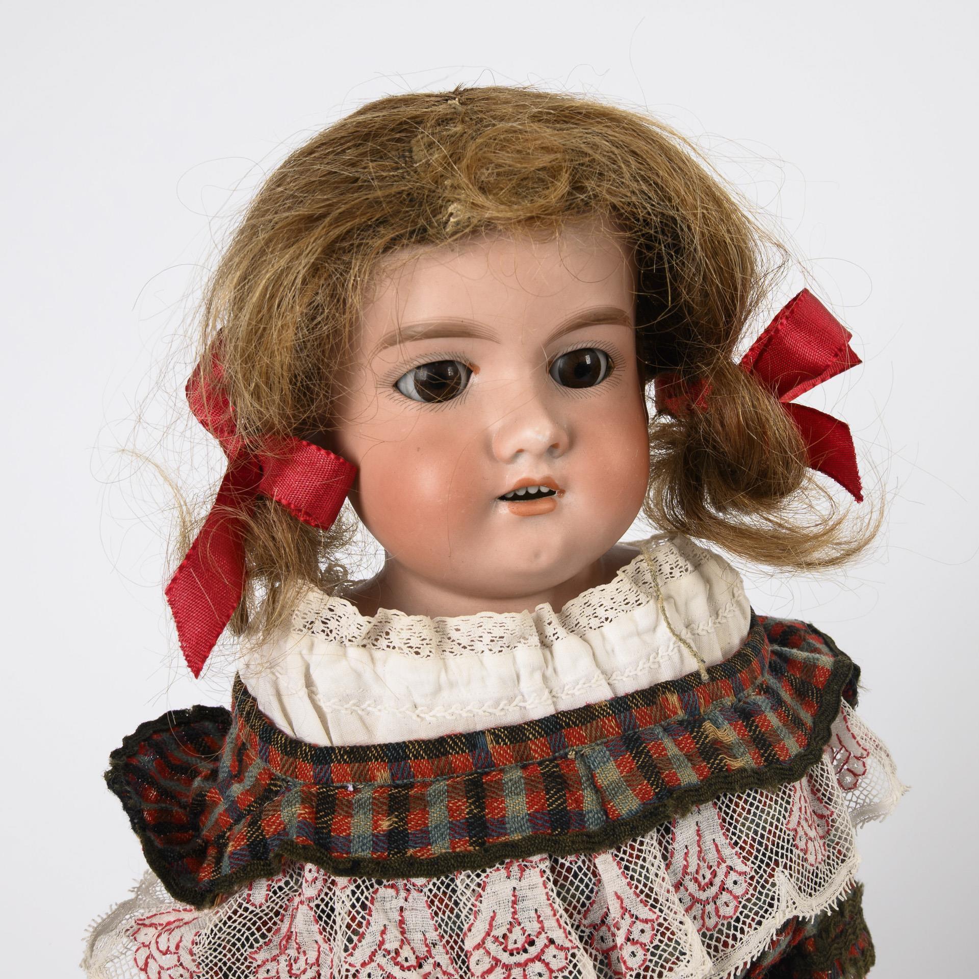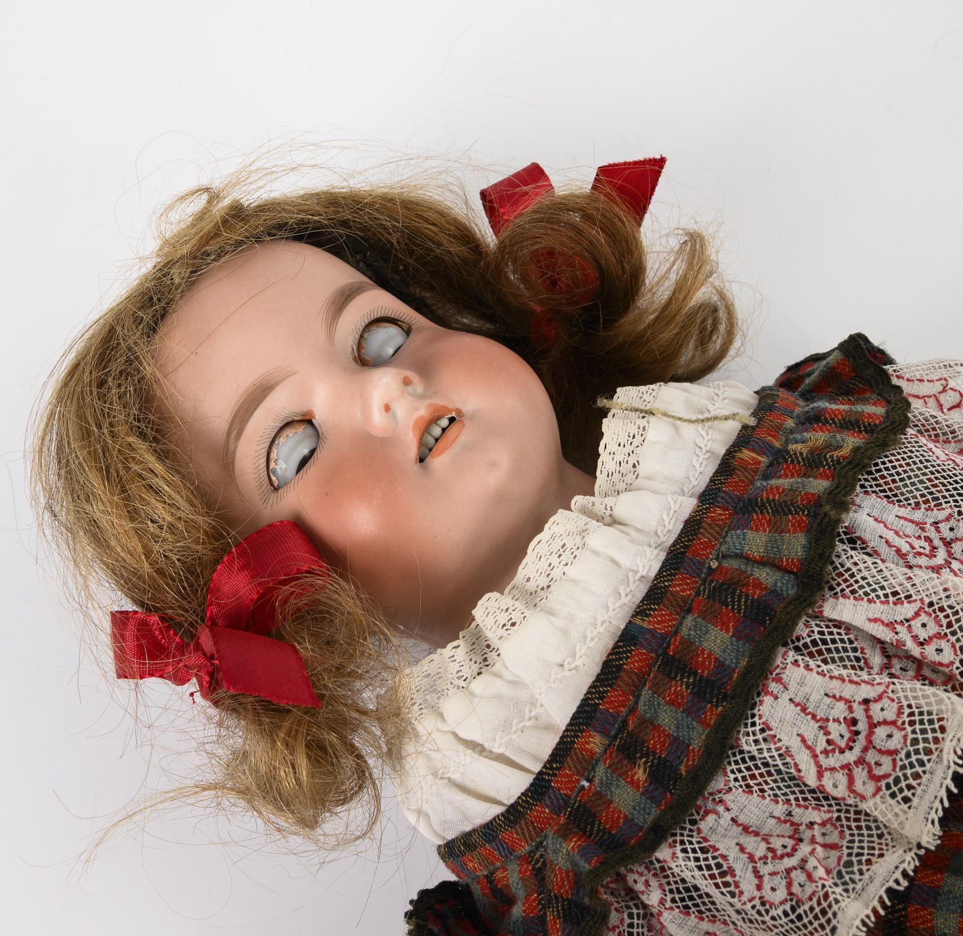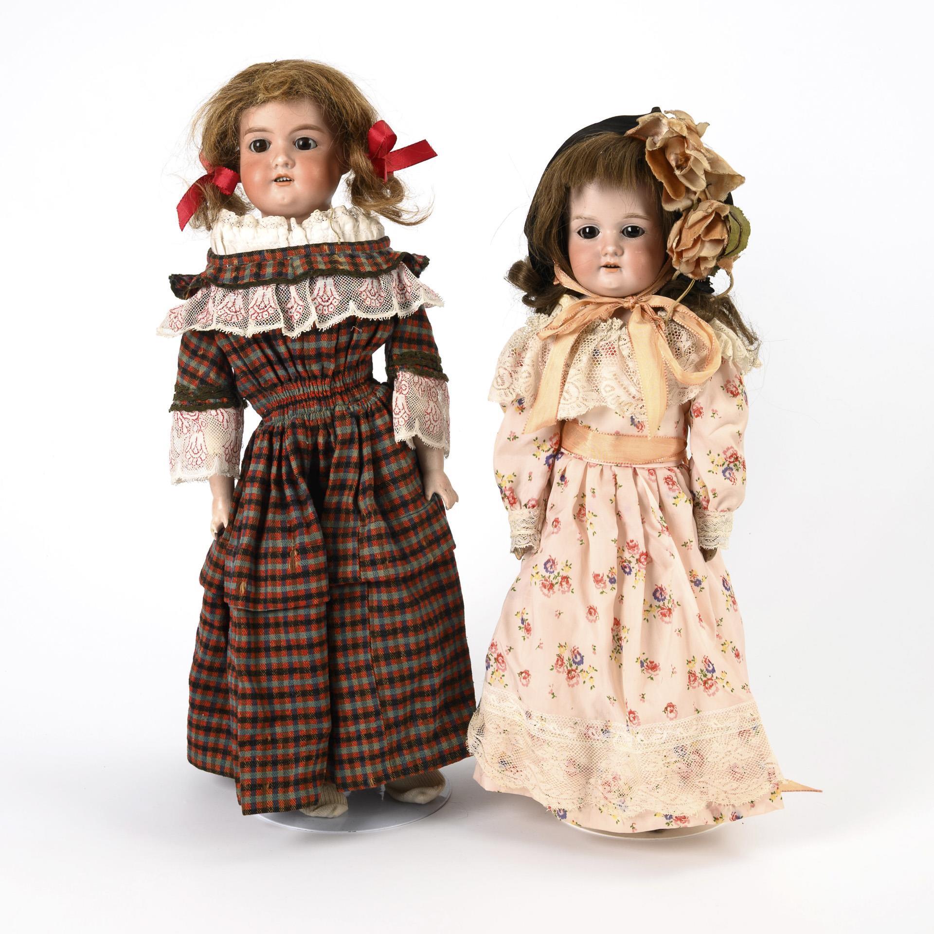 Beide mit Kindergesicht, braunen Schlafaugen und brauner Echthaarperücke. 1x Lederkörper mit Biskuitarmen, kariertes Kleid. 1 Finger rechts fehlt. L 52 cm. / 1x Wachstuchkörper mit Gliederarmen, rosa Kleid mit Blumendruck. L 45 cm. Köpfe durchleuchtet: ohne Defekte. Körper jeweils mit leichten Altersspuren.