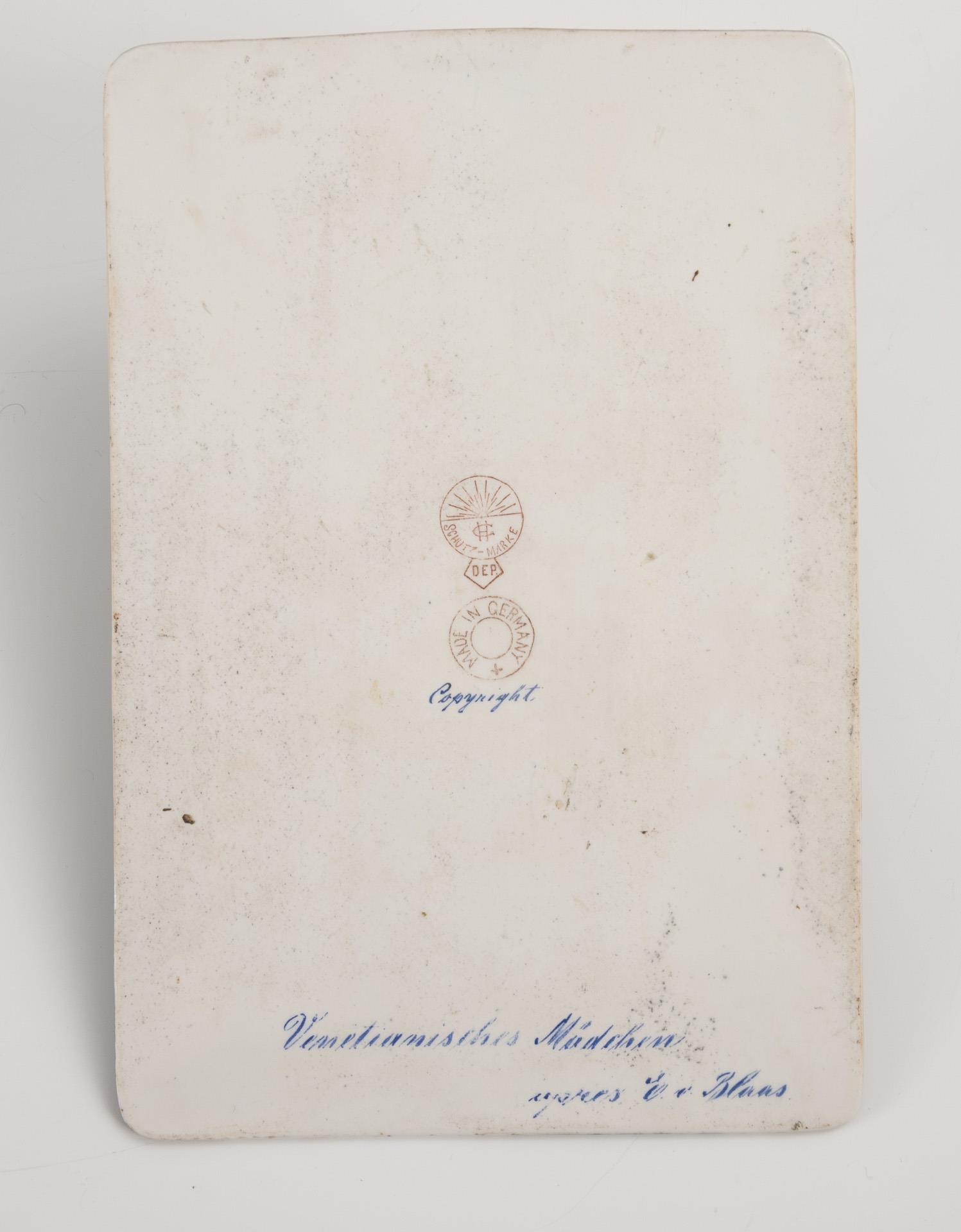 Rechteckige Platte mit dem Bildnis eines Mädchens in Trachtenkleidung, einen Korb tragend, nach einem verso bezeichnet "Venezianisches Mädchen apres E. v. Blaas" (= Eugen von Blaas).