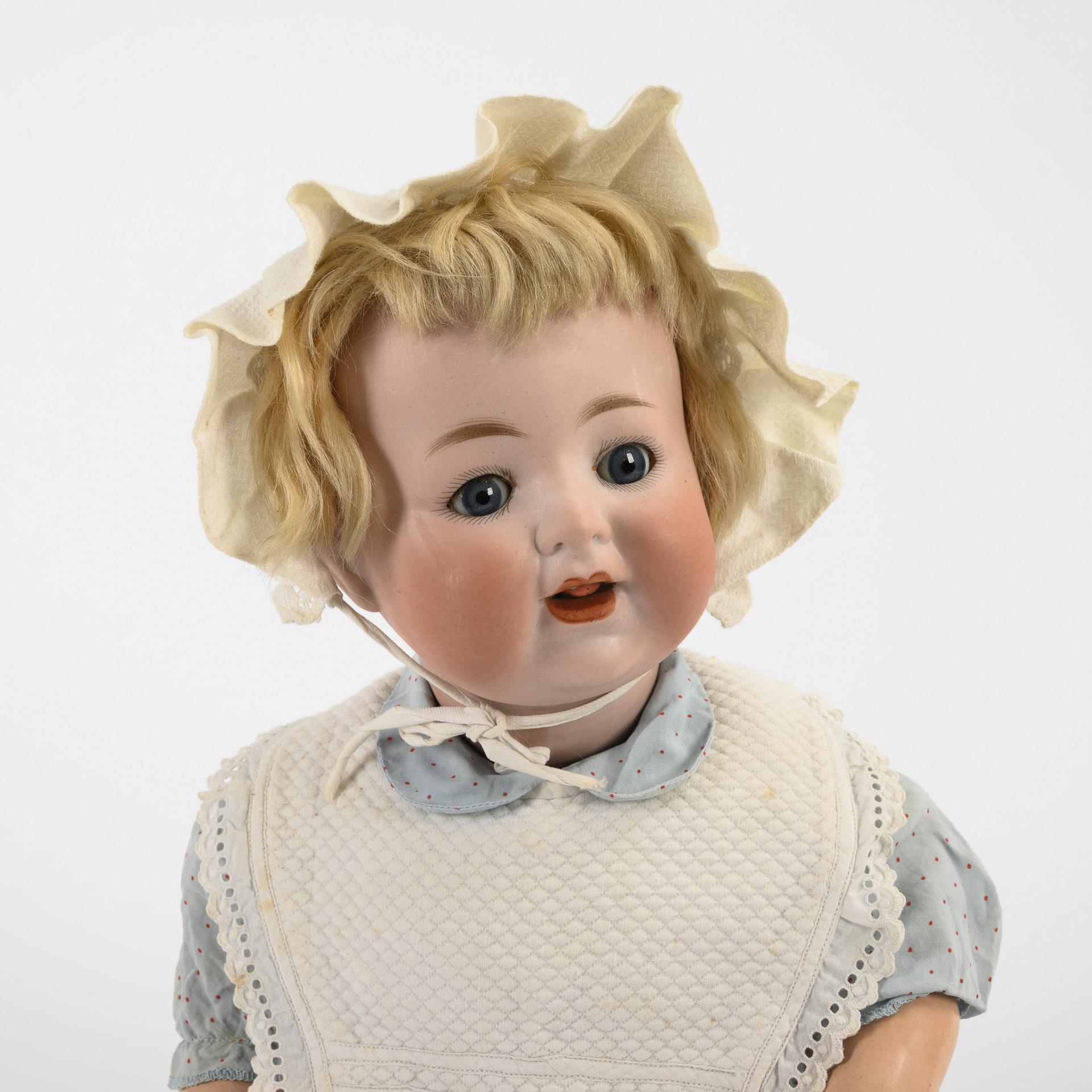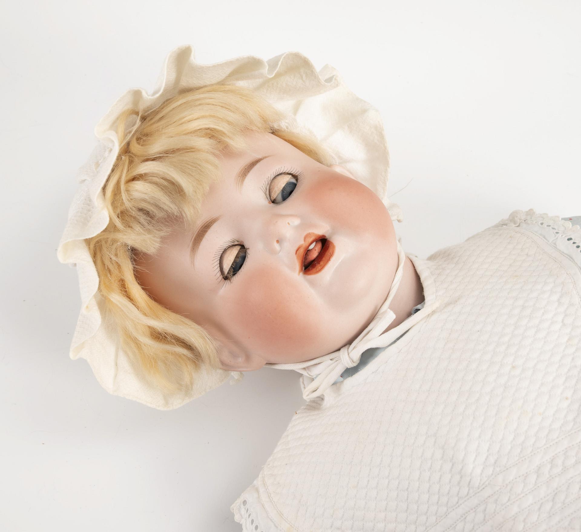 Kurbelkopf, blaue Schlafaugen, 1 Zahn, bewegliche Zunge, blonde Mohairperücke. 5-teiliger Sitzbabykörper mit intakter Stimme, blauem Kleid und weißer Haube. Kopf durchleuchtet: ohne Defekte, lediglich minimaler Farbabrieb an der linken Schläfe. 2 Finger repariert, eine Hand rissig.