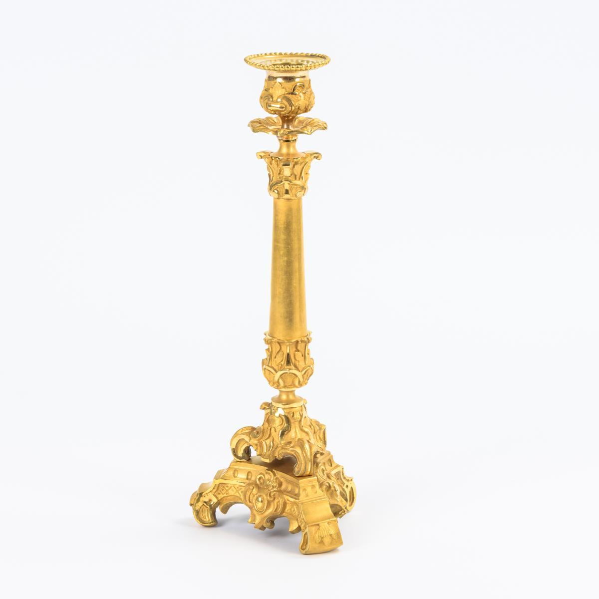 Qualitätvoll gefertigter Bronzeleuchter mit reicher Reliefzier. 3-seitiger Sockel, Säulenschaft und Vasentülle.