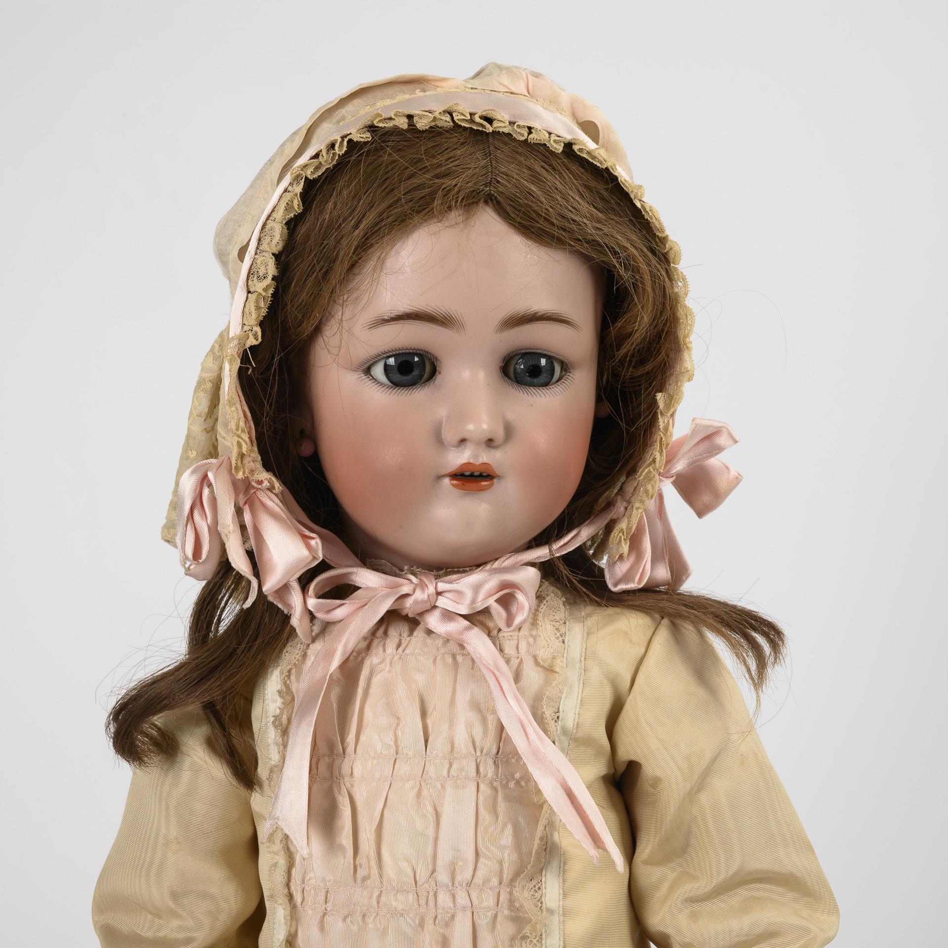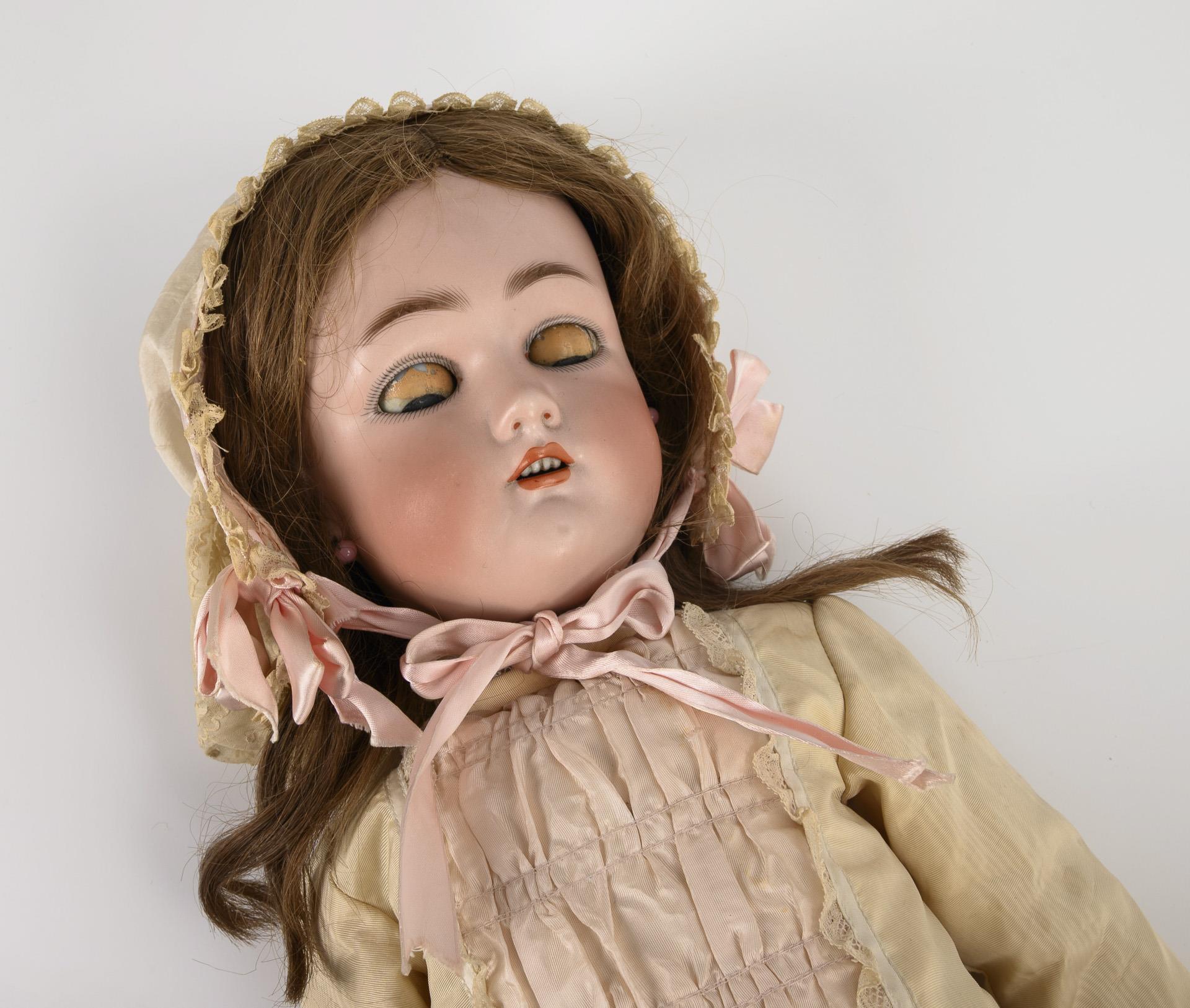 Kurbelkopf, blaue Schlafaugen, Ohrringe, braune Echthaarperücke. 15-teiliger Gliederkörper. Cremefarbenes Kleid, passende Haube, weiße Schuhe. Kopf durchleuchtet: ohne Risse, lediglich minimaler Perückenpull und winzige Chips an den Ohrlöchern. 1 Finger und 1 Fuß repariert.