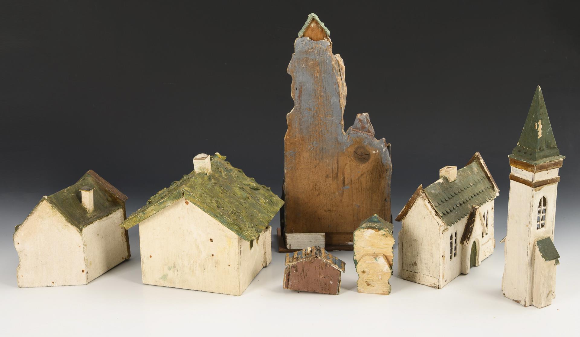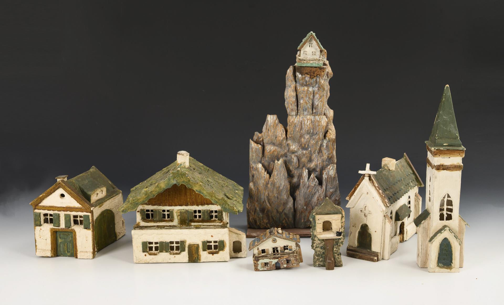 Verschiedene kleine Häuser, 2 Berge als Hintergrund, dazu einige Luffa- und Span-Bäume. Defekte, teils nachgestrichen.