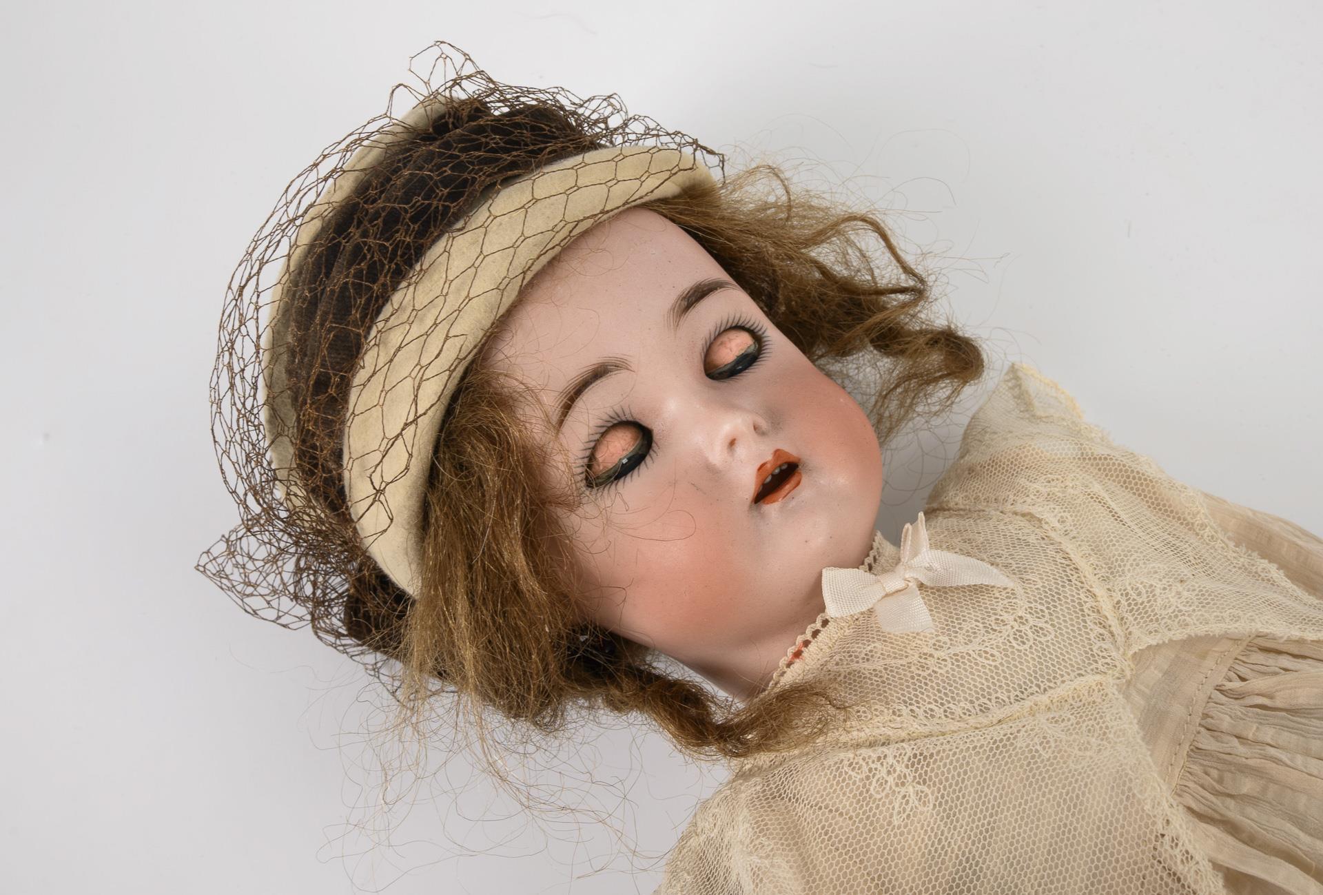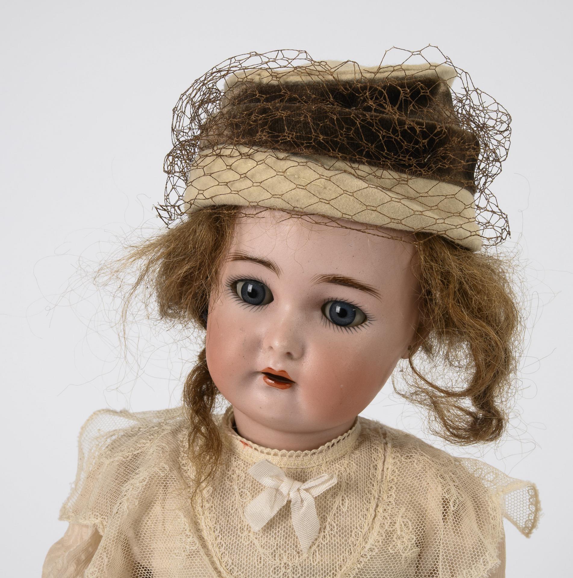 Kurbelkopf, blaue Schlafaugen, Ohrlöcher, mittelblonde Perücke. 15-teiliger Gliederkörper. Cremefarbenes Kleid aus zartem Stoff, heller Hut mit Samtband und Schleier, Wachstuchschuhe. Kopf durchleuchtet: ohne Defekte, lediglich winzige Chips an den Ohrlöchern. Körper partiell übermalt, 1 Fingerkuppe links fehlt.