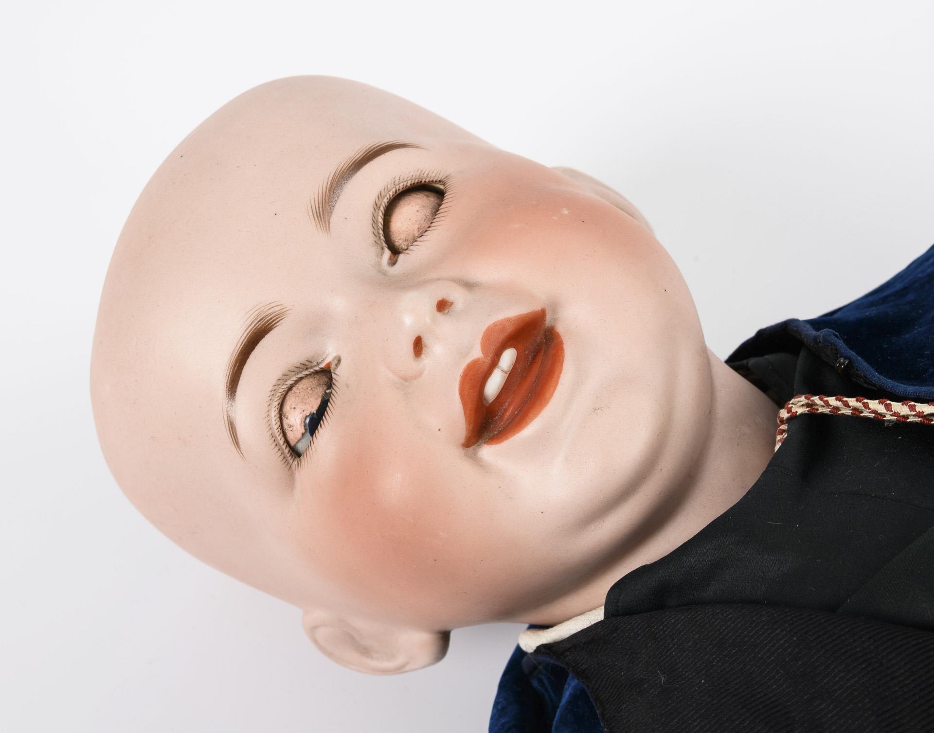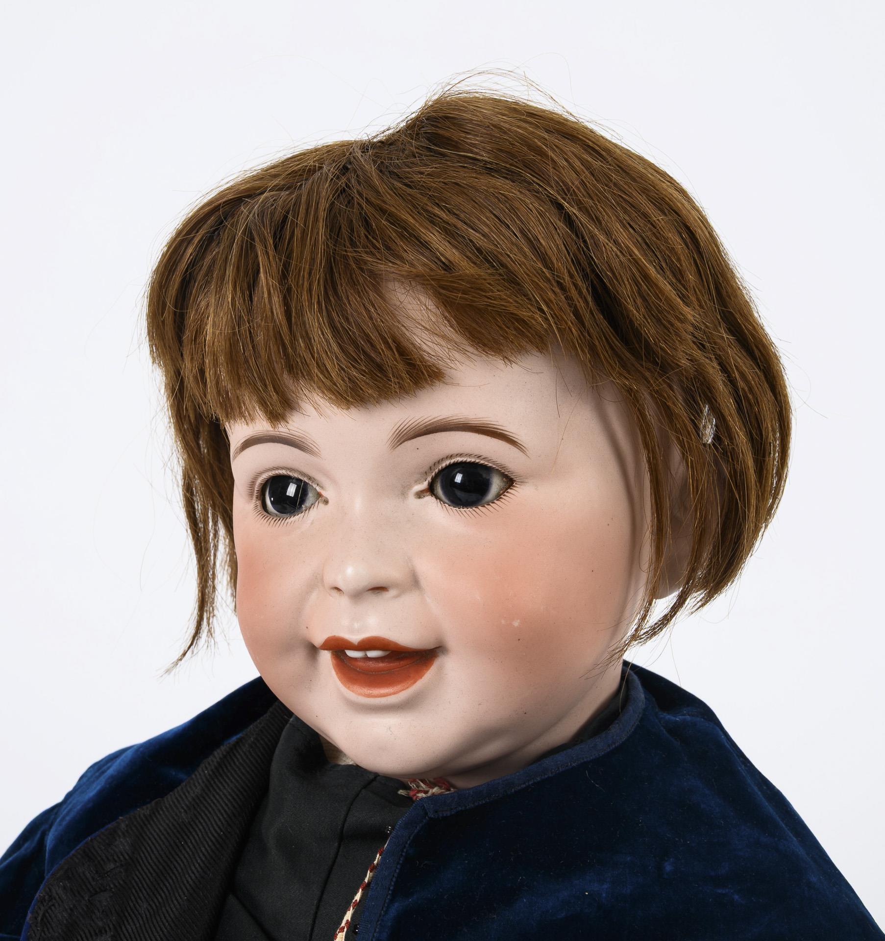 Kurbelkopf, braune Schlafaugen, offen/geschlossener Mund mit 2 modellierten Zähnchen, braune Echthaarperücke. 5-teiliger Sitzbabykörper. Dunkelblauer Samtanzug. Kopf durchleuchtet: ohne Risse, lediglich 1 winziger Chip an der Halskurbel. Linke Hand mit Farbabplatzern.