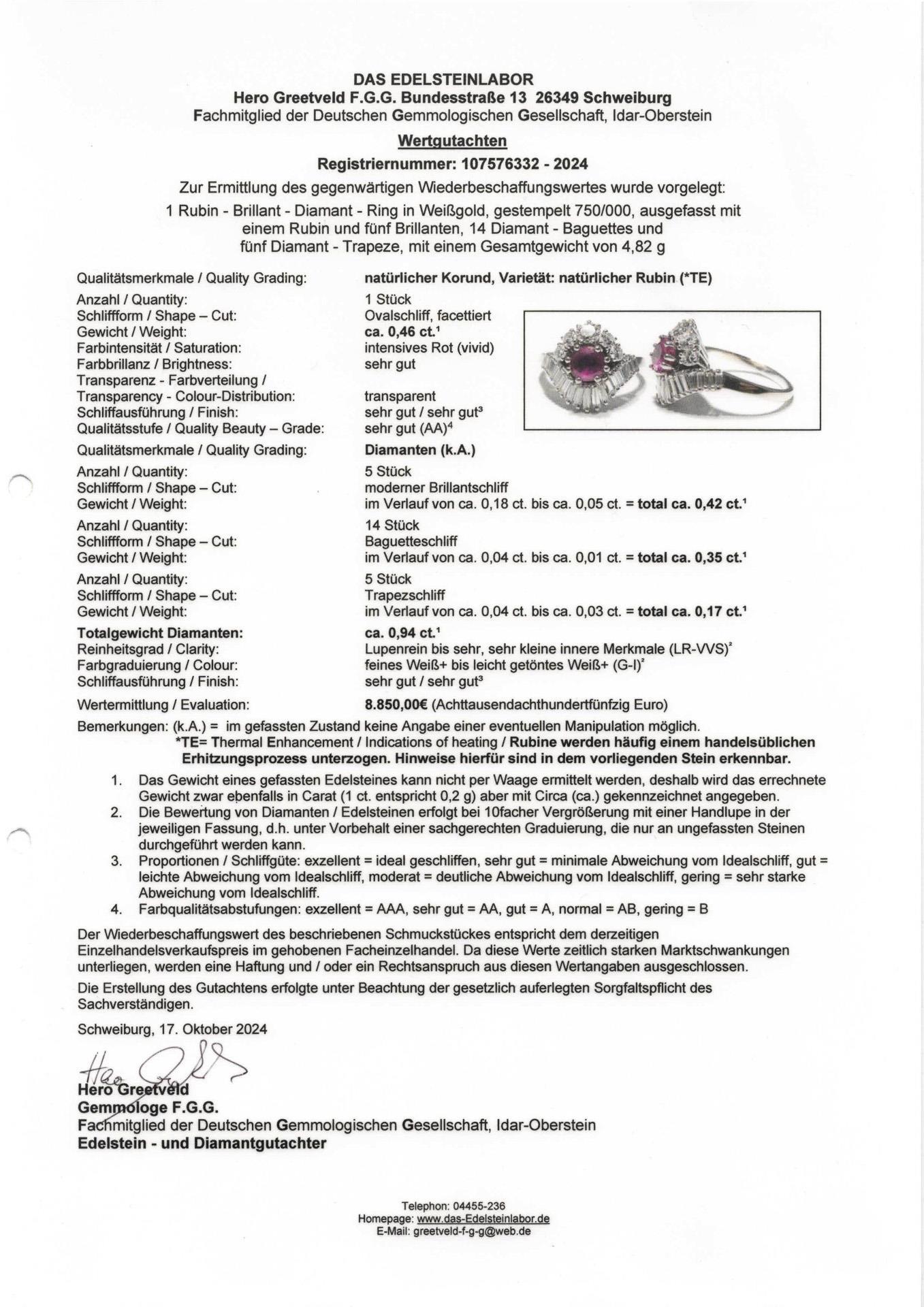 Weißgold 750 gestempelt. Ringgröße 49, der Ringkopf max. ca. 13,45 x 15,19 mm, der Rubin ca. 0,46 ct, die Diamanten insgesamt ca. 0,94 ct. 4,82 g.