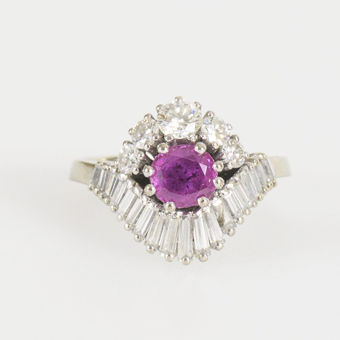 Ring mit Rubin und Diamant-Baguettes.