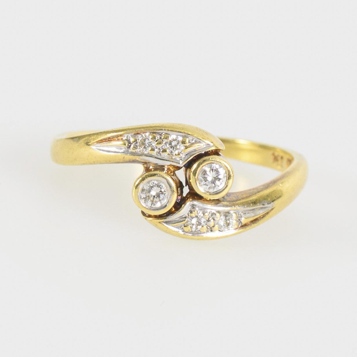 Toi-et-Moi-Ring mit 2 in Weißgold zargengefassten Brillanten, zu beiden Seiten der Schiene je mit 2 kleineren, pavégefassten Brillanten ornamentiert. Leichte Tragespuren.
