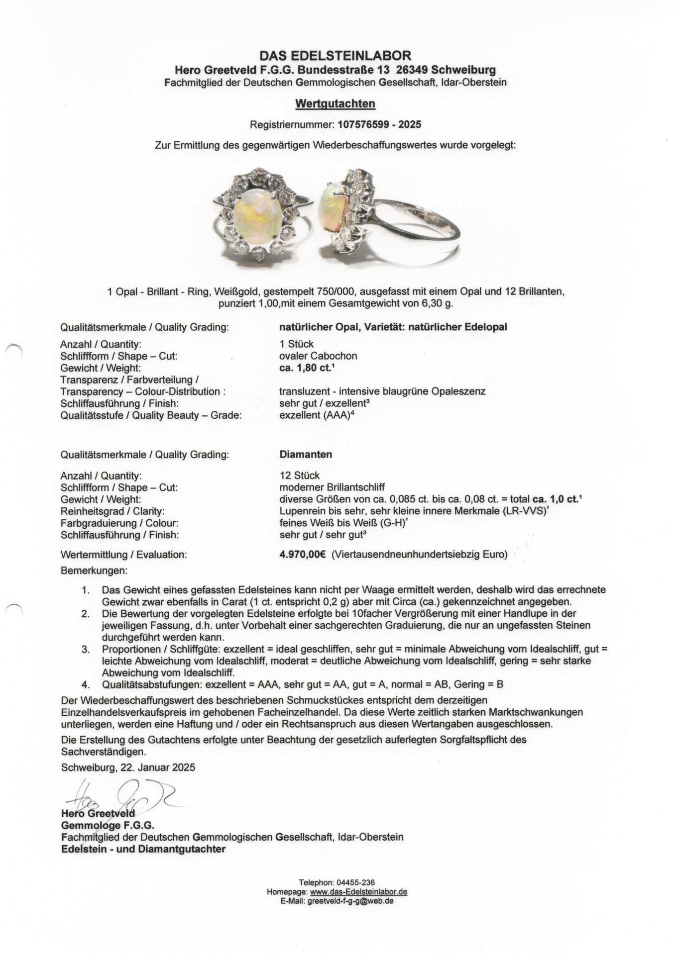 Weißgold 750 gestempelt. Ringgröße 54, der Ringkopf max. 11,72 x 9,42 mm, der Opal ca. 1,80 ct, die Brillanten zusammen ca. 1,0ct (zusätzlich gestempelt)/G-H/LR-VVS. 6,30 g.