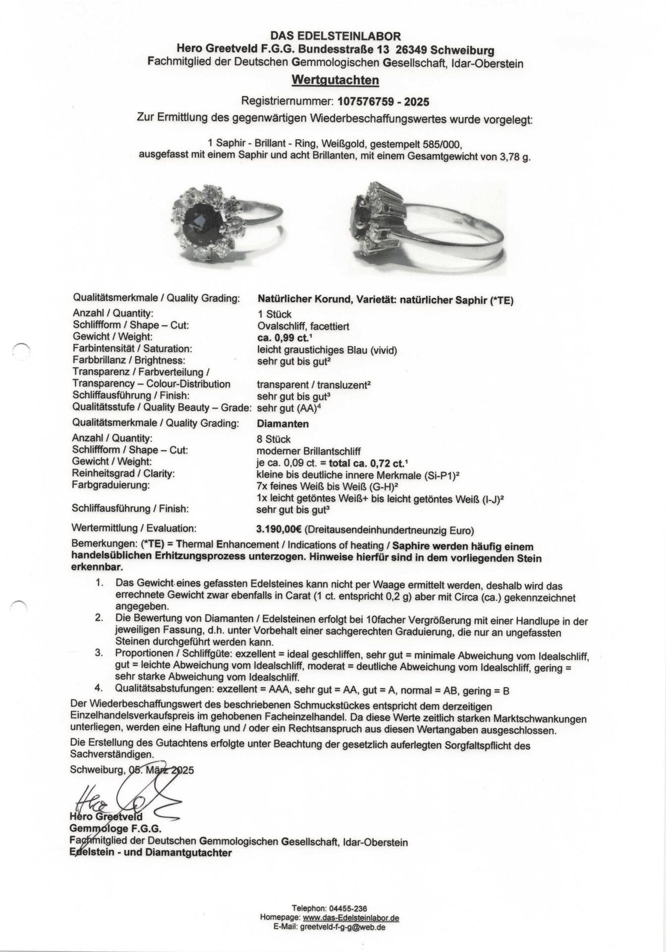 Weißgold 585 gestempelt. Ringgröße 55, der Saphir ca. 0,99 ct, die Brillanten zusammen 0,72 ct/Si-P1/7x G-H, 1x I-J. 3,78 g.