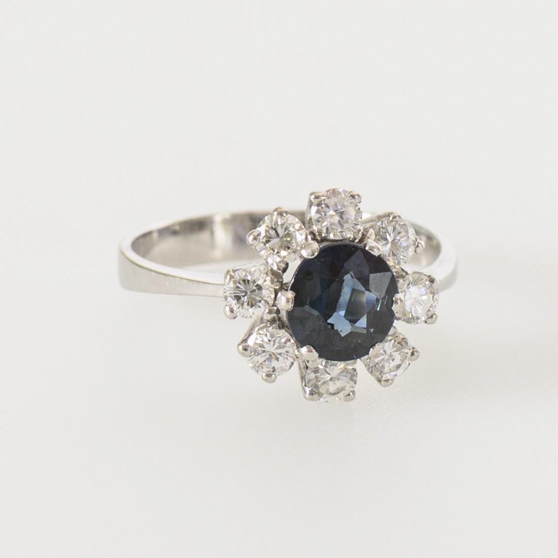 Daisy-Ring mit zentralem, rund-facettiertem Saphir, dieser wohl wärmebehandelt, umgeben von 8 Brillanten zwischen einer sich nach unten verbreiternden Schiene. Unterseitig mit leichten Tragespuren.