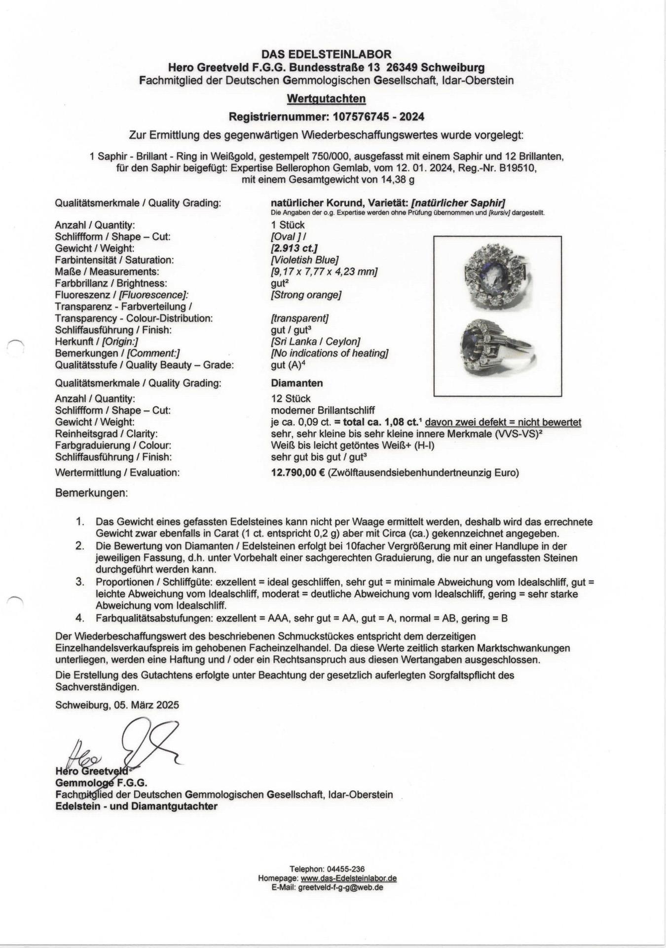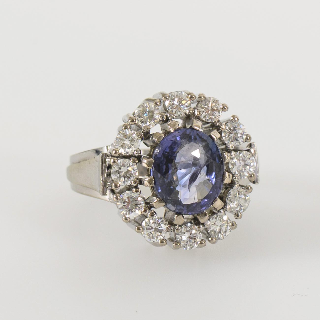 Ring in Entourage-Gestaltung mit einem oval-facettierten Saphir, umgeben von 12 Brillanten, in einem erhöhten Ringkopf zwischen einer breiten Schiene. Unterseitig mit leichten Tragespuren, 2 Brillanten mit Chips, diese laut Gutachten nicht bewertet.