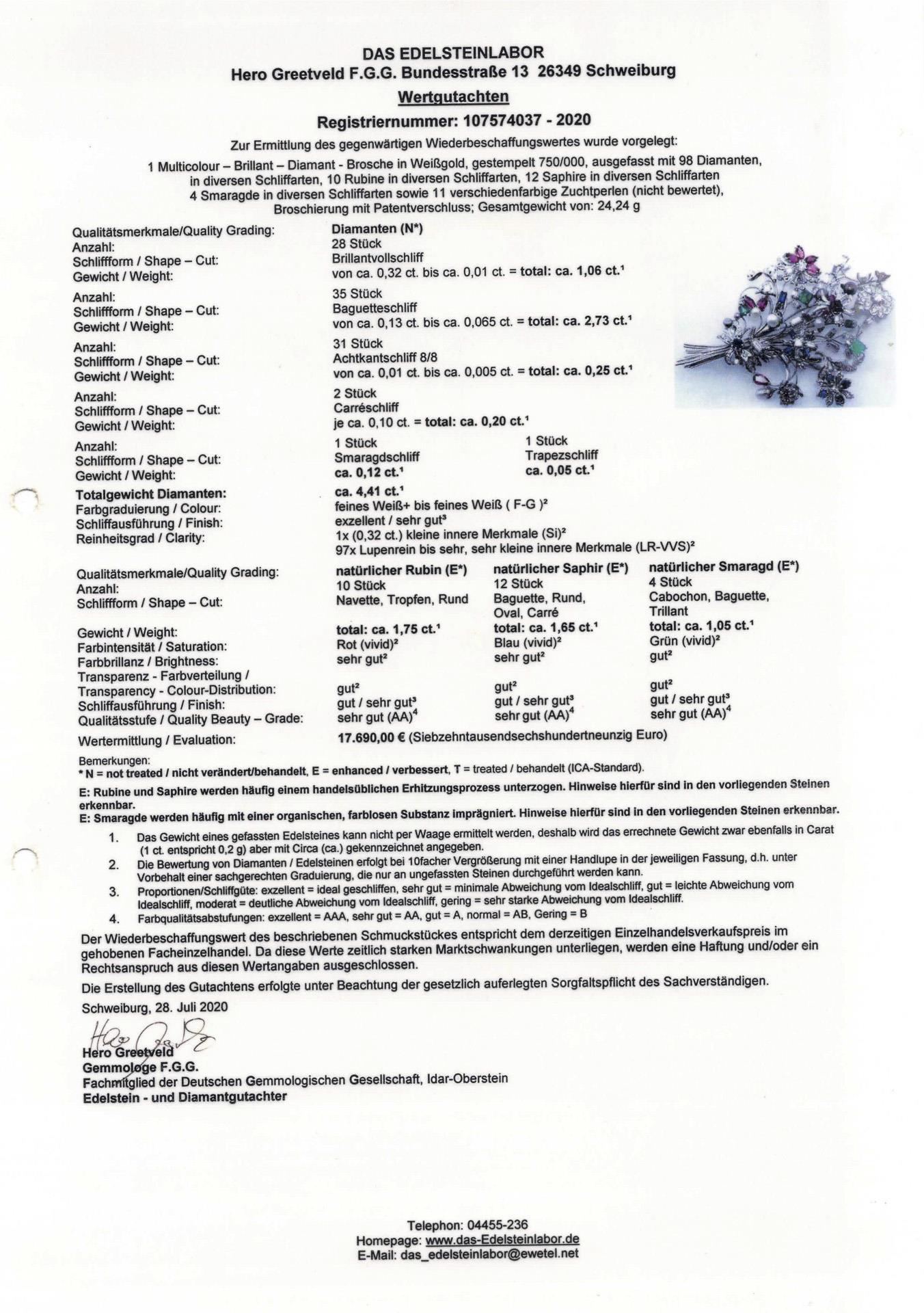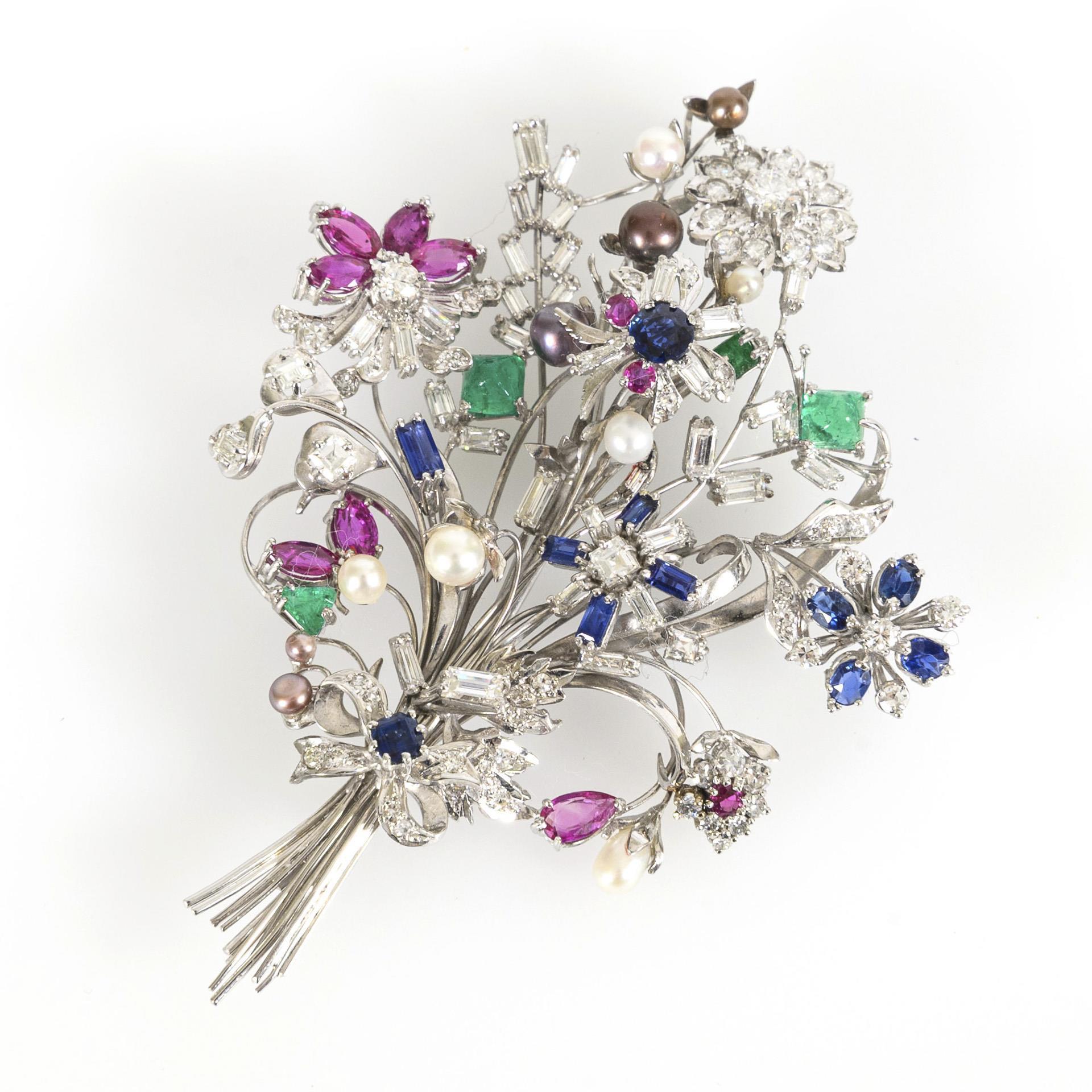 Brosche in großformatiger Ausgestaltung in Form eines Blumen-Bouquets, reich besetzt mit Diamanten in diversen Schliffformen, 10 natürlichen Rubinen, 12 natürlichen Saphiren und 4 natürlichen Smaragden (jeweils farbverbessert) sowie 11 kleinen Zuchtperlen in verschiedenen Farbvariationen. Rückseitig mit Patentverschluss.