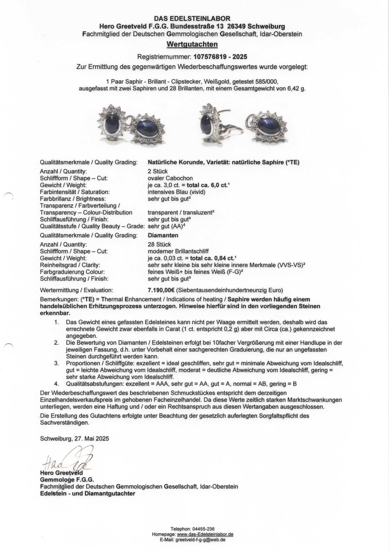 Weißgold 585 geprüft. 16,52 x 14,07 mm, die Saphire zusammen ca. 6,0 ct., die Brillanten zusammen ca. 0,84 ct. 6,42 g.