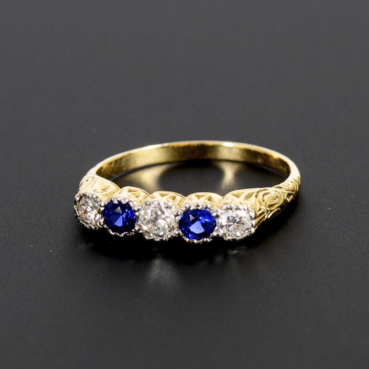 Historischer Ring, wohl Mitte der 2. Hälfte des 19. Jahrhunderts, mit 3 Altschliff-Brillanten und 2 blauen Farbsteinen, wohl Saphiren, alternierend in Weißgold in den reich ornamental ausgestalteten Ringkopf gefasst. Die blauen Farbsteine mit leichten Tragespuren an den Schliffkanten, dies erst unter zehnfacher Vergrößerung sichtbar.
