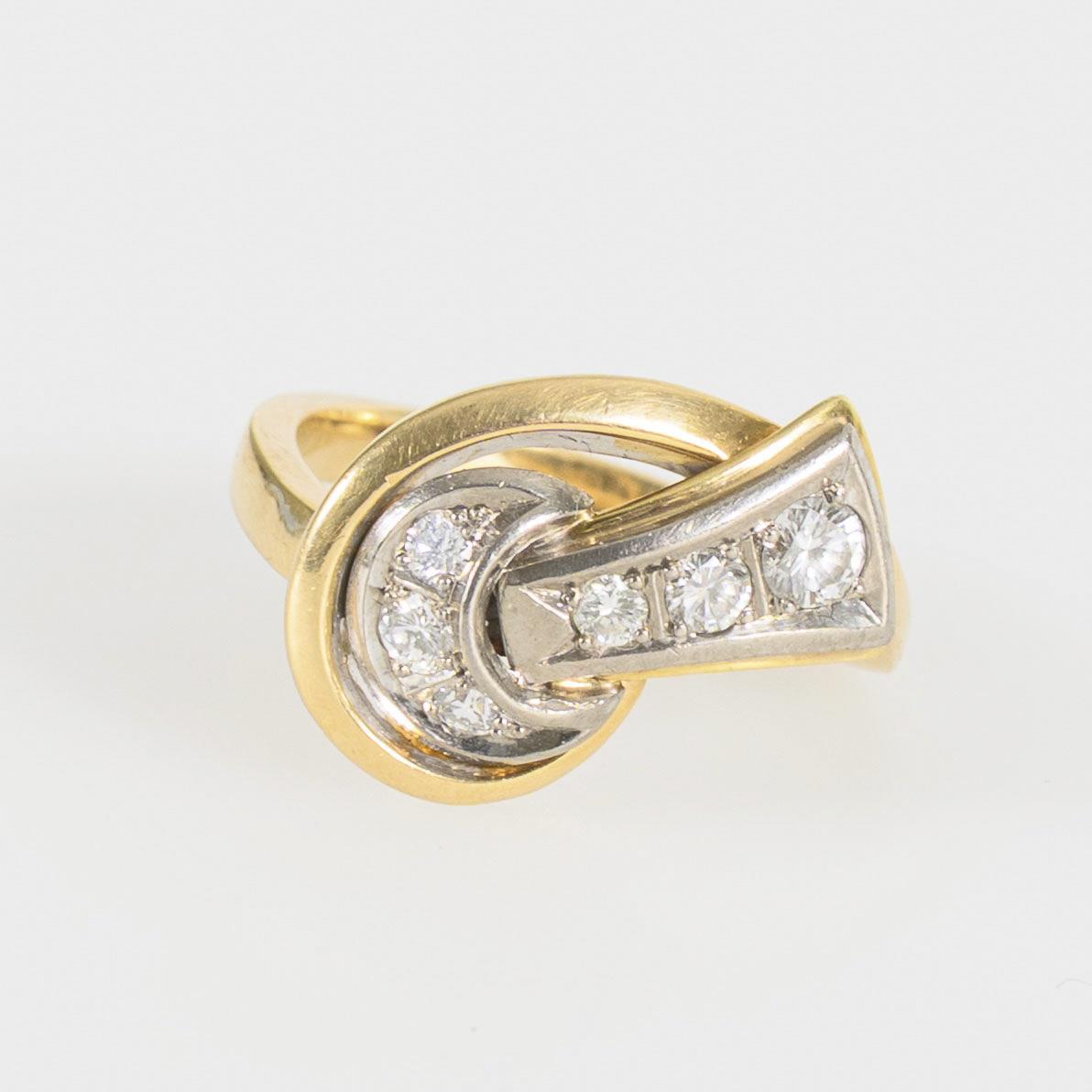 Zweifarbiger Ring mit dynamisch gestaltetem Ringkopf mit einem an einen Knoten erinnernden Weißgold-Element, dieses mit 6 Brillanten verschiedener Größe besetzt. Leichte Tragespuren.