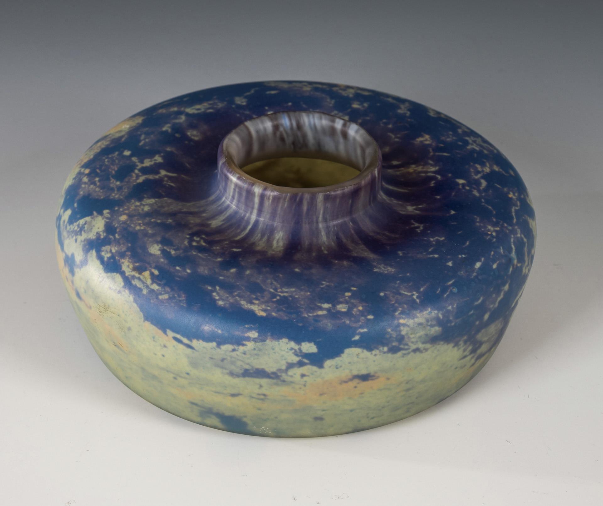 Farbloses Glas mit opalweißen und blauen Pulvereinschmelzungen in der Zwischenschicht. H 6,5 cm.