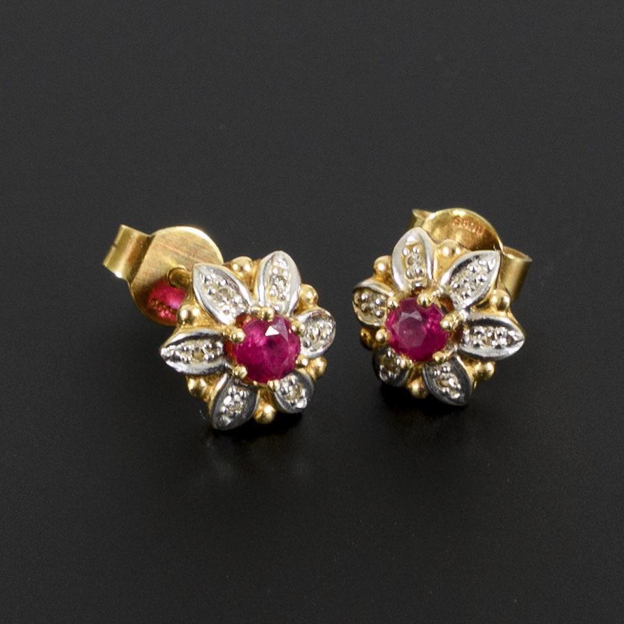 Zweifarbige Ohrstecker in der Form von kleinen Blüten mit je einem roten Farbstein, wohl Rubin, sowie je einem kleinen Diamanten auf den Blütenblättern.
