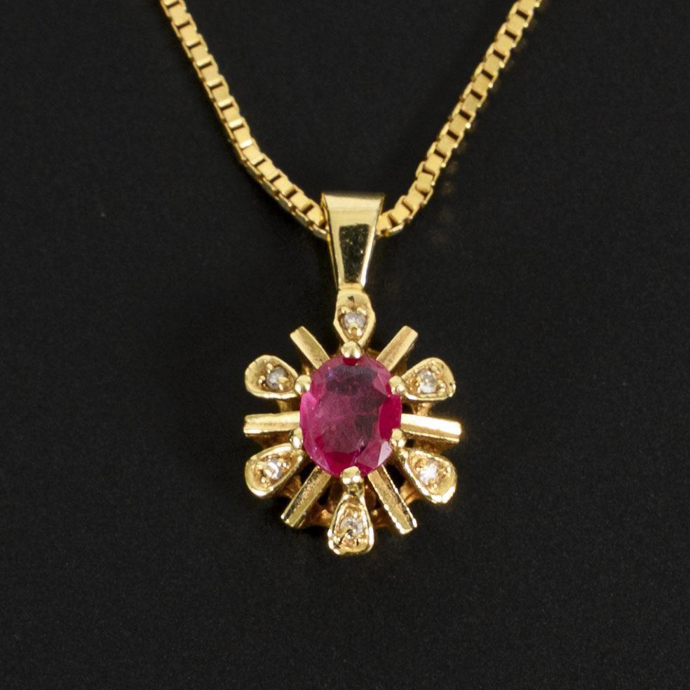 Anhänger mit rotem Farbstein, wohl Rubin, im Anhängerelement von 6 kleinen, eingelassenen Diamanten umgeben, an einer Venezianerkette.