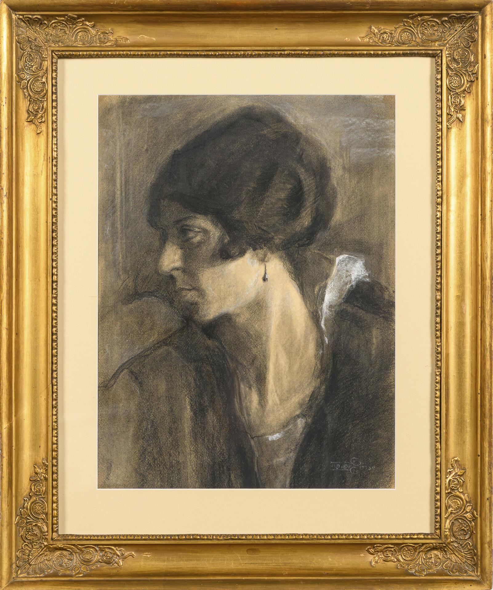 Porträt einer zur Seite blickenden, modisch gekleideten Frau mit markanten Gesichtszügen.