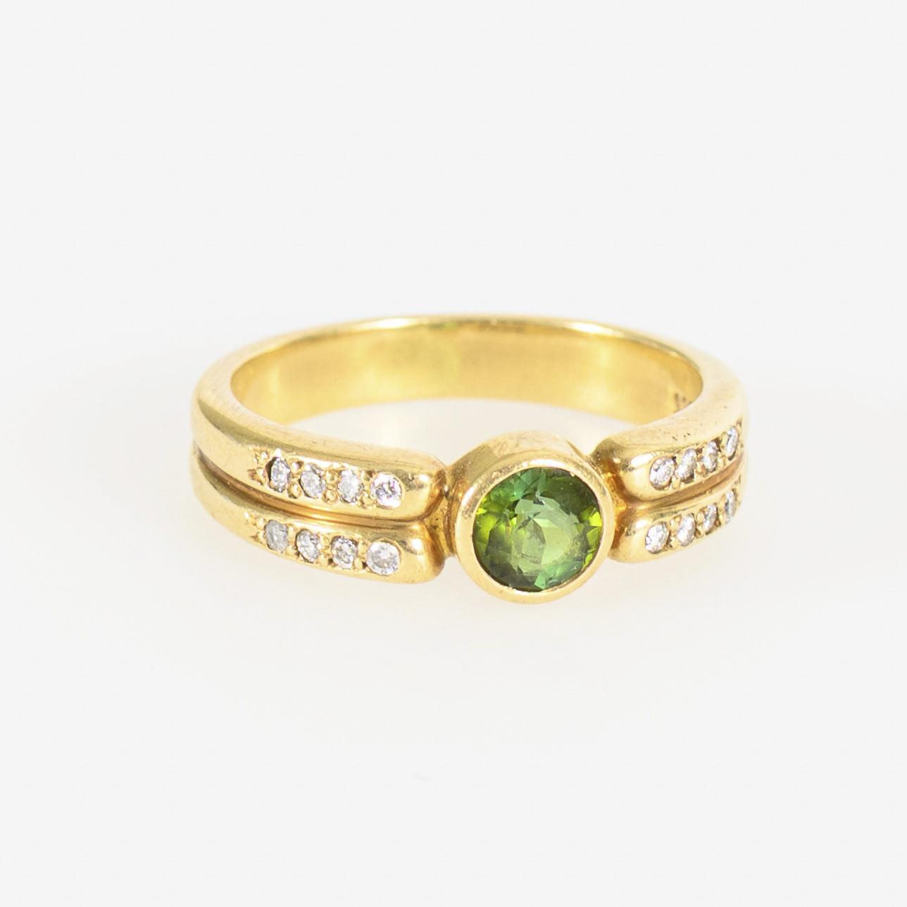 Ring mit einem grünen, rund-facettierten Farbstein zwischen einer doppelbändrigen Schiene, diese an den Ringschultern mit kleinen Brillanten besetzt. Mit leichten Tragespuren, z. T. an den Schliffkanten des grünen Farbsteins, dies vor allem unter zehnfacher Vergrößerung sichtbar.